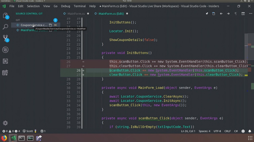 次はLive Shareかな。別の人から壇上のScottにヘルプがw Ubuntu上のVisual Studio Codeを使ってLive Shareでセッションを共有して開発やデバッグ。コミット済みコードとのDiffみたり。![]()
