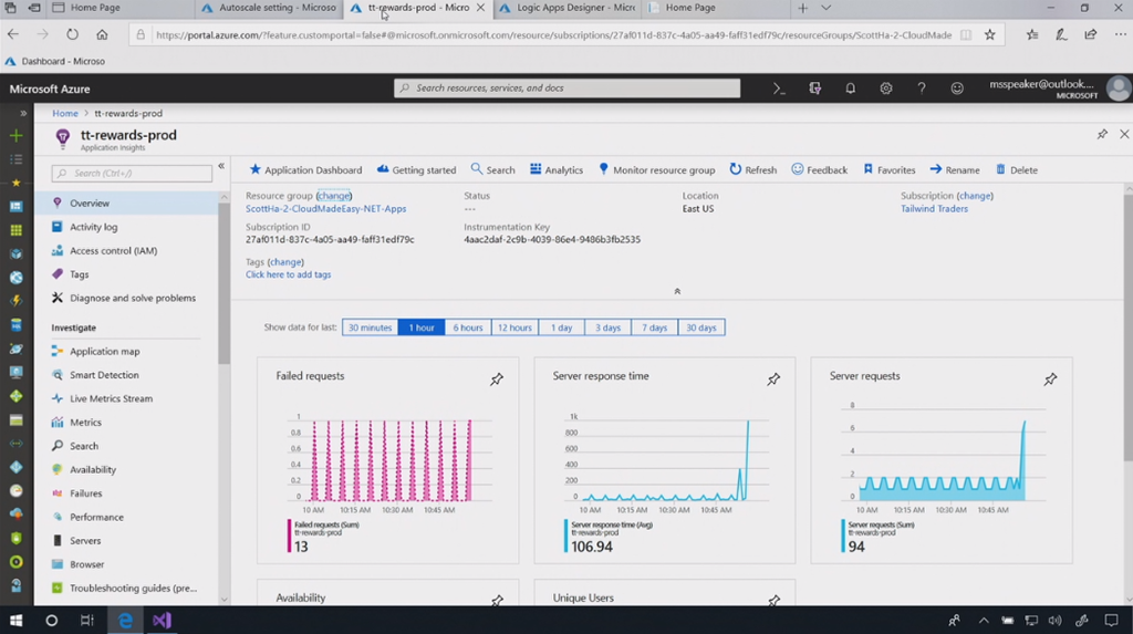 デモはCecil氏。VSからAzure(Cloud)へのデプロイとか。ルール決めてオートスケールアウトやパフォーマンス見たり例外を確認したり。ユーザーフローも見れます。Debug Snapshotを使って例外時点の変数などの状態を見ることもできます。そのままVisual Studioで開いたり。![]()