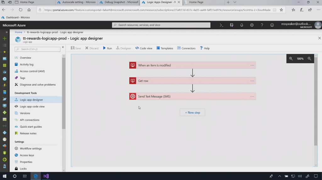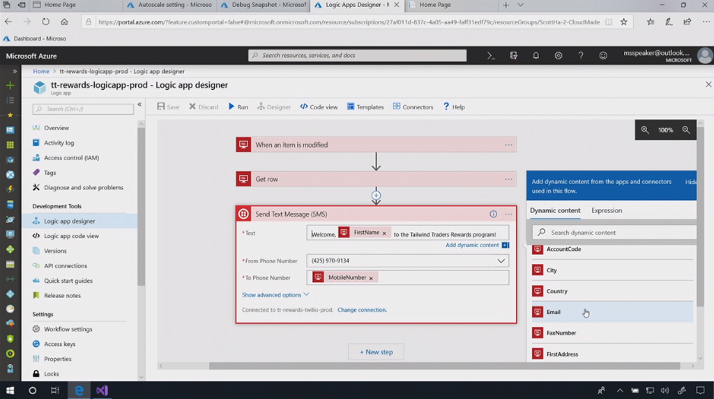 Logic Appsでフローを作ったり。デモのはテキストメッセージを送信したりする感じのフローですね。![]()