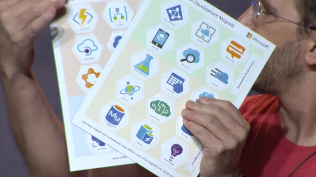 次のデモはChristos氏。ホワイトボードにAzureのサービスアイコンなマグネットを張って構成を書いていきます。それを写真でとると張ったり書いたサービスを認識、該当リソースをそのままAzure上へデプロイ。このアプリそのものはComputerVisionやらを使った.NETアプリですね。![]()