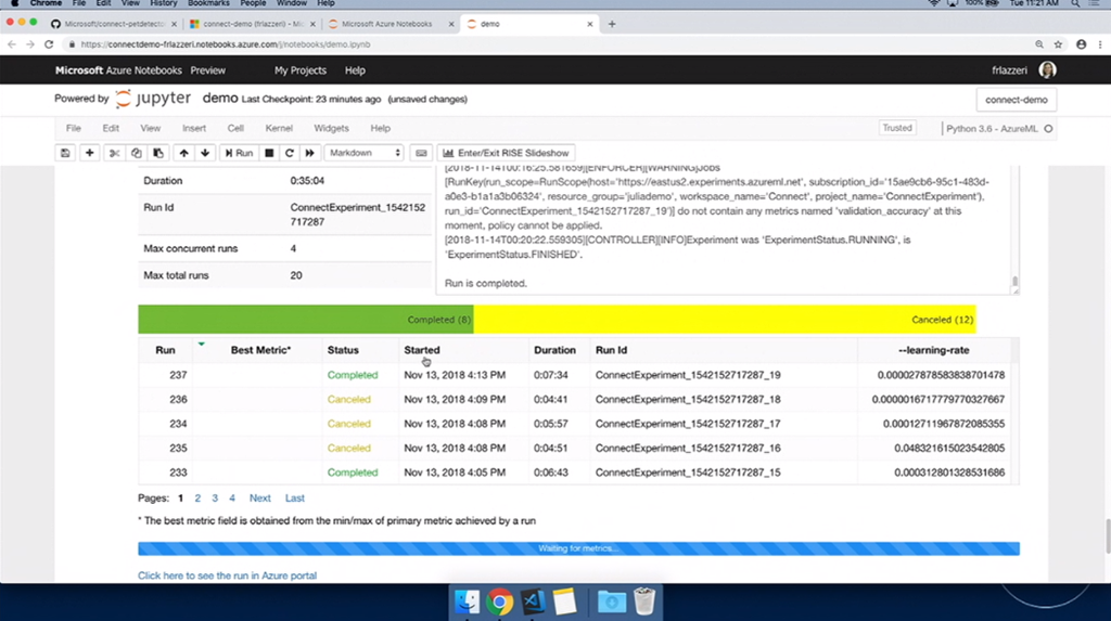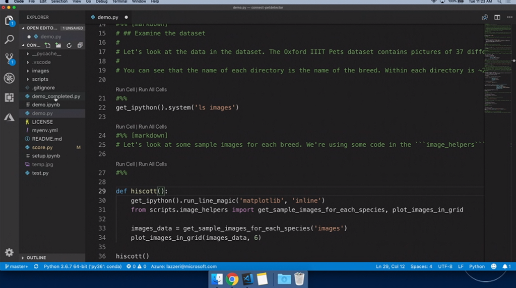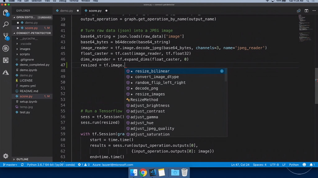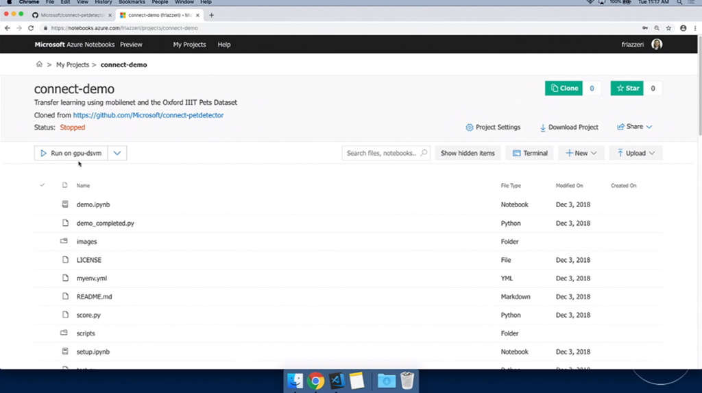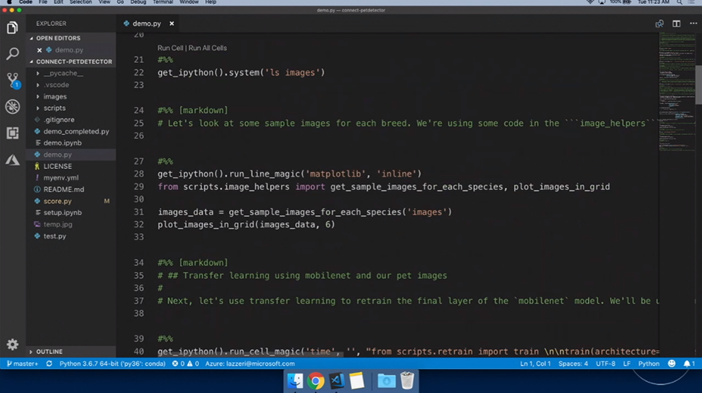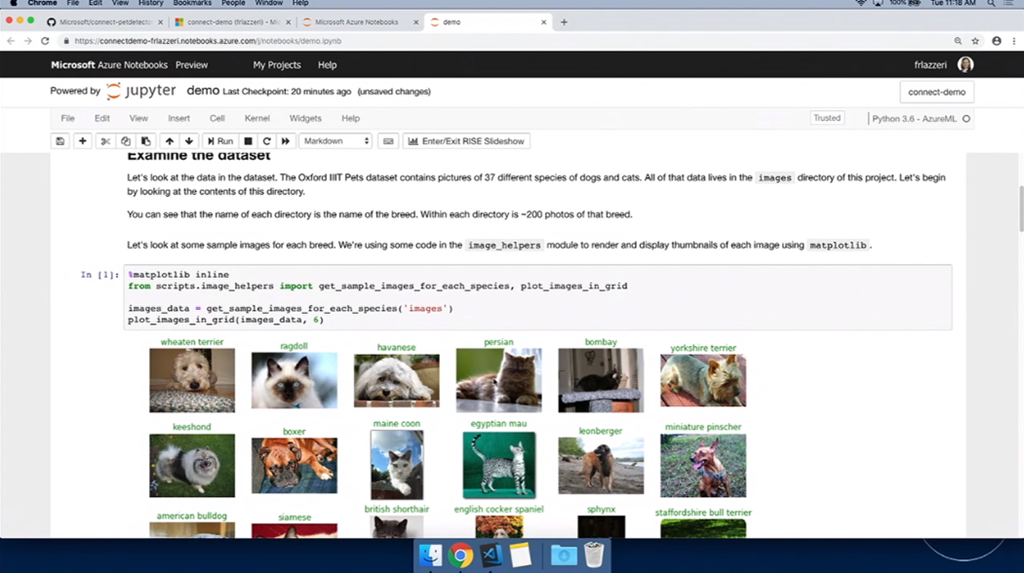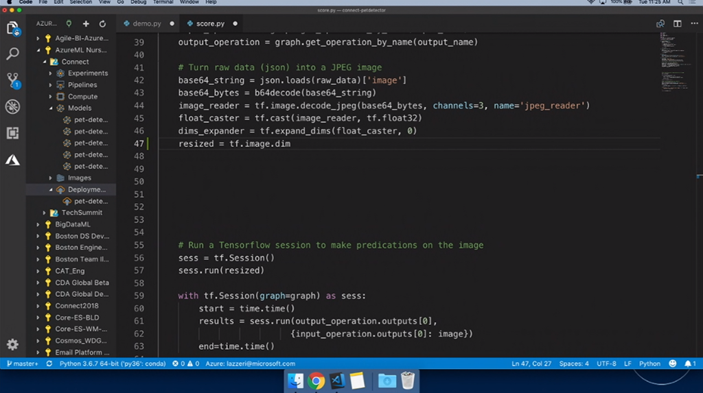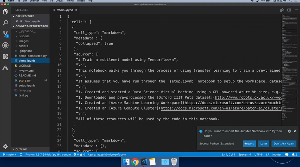 次はAIや機械学習関連。デモはFrancesca氏。Jupyter Notebookを使って学習させたりします。デモだとTensorflow使って学習させる感じ。そのまま学習、できたらAzure ML Serviceに接続して実行とか。できたJupyter NotebookのコードをVisual Studio CodeでインポートしてそのままPythonコードを編集、結果をインタラクティブに確認もできます。ScoreファイルもML Serviceが生成してくれてる感じかな。IntelliCodeを使ったAIなインテリセンスも使えます。最後にAzure上にモデルをデプロイ、DockerコンテナーやACIにデプロイもできます。test用Pythonコードを実行すればそのまま評価できますね。![]()