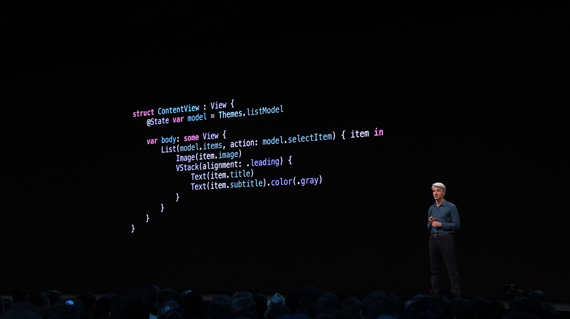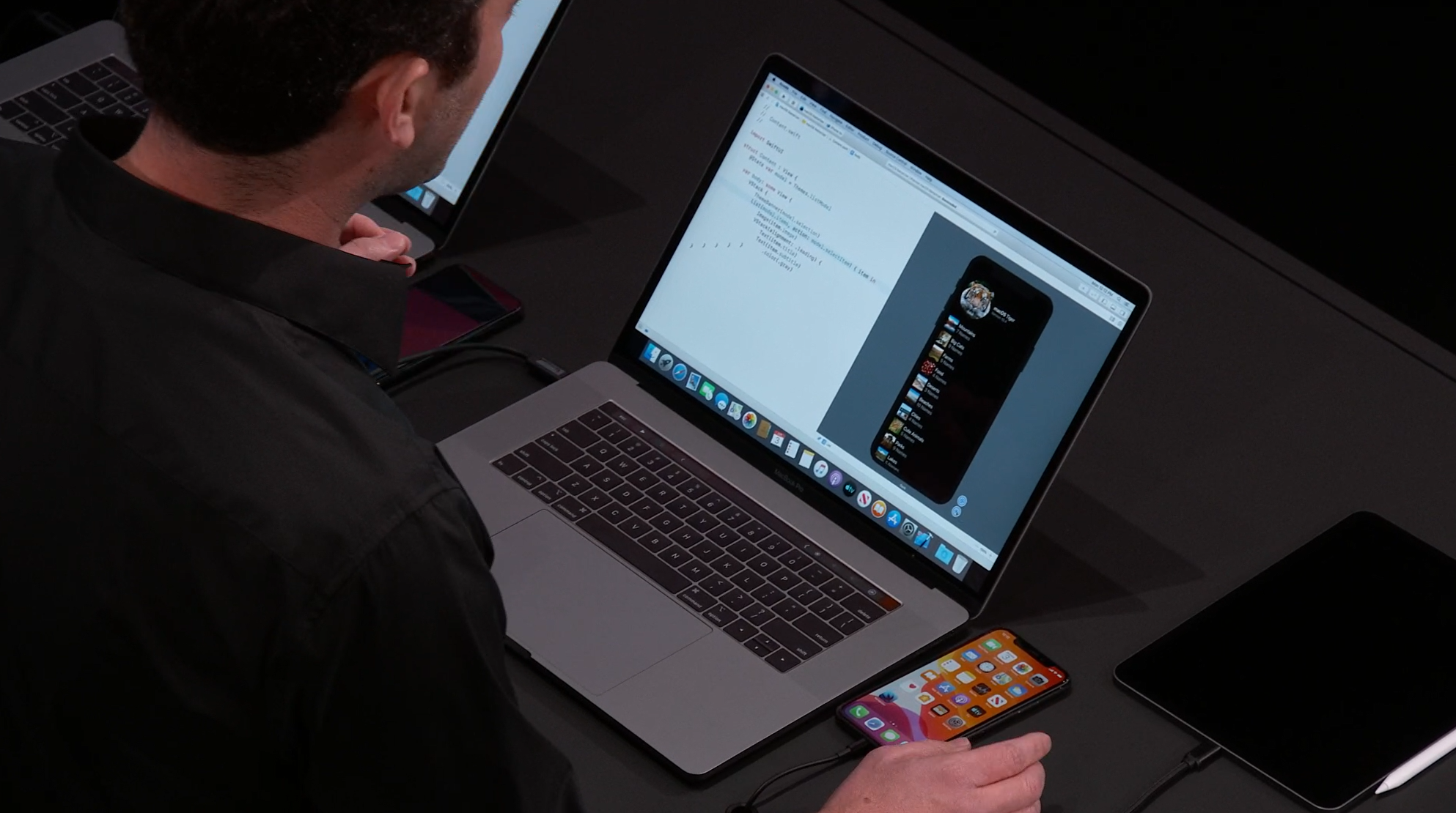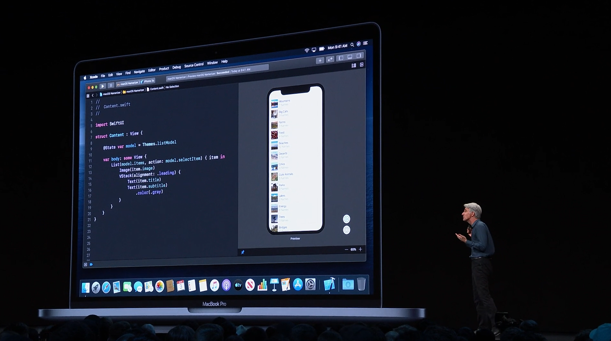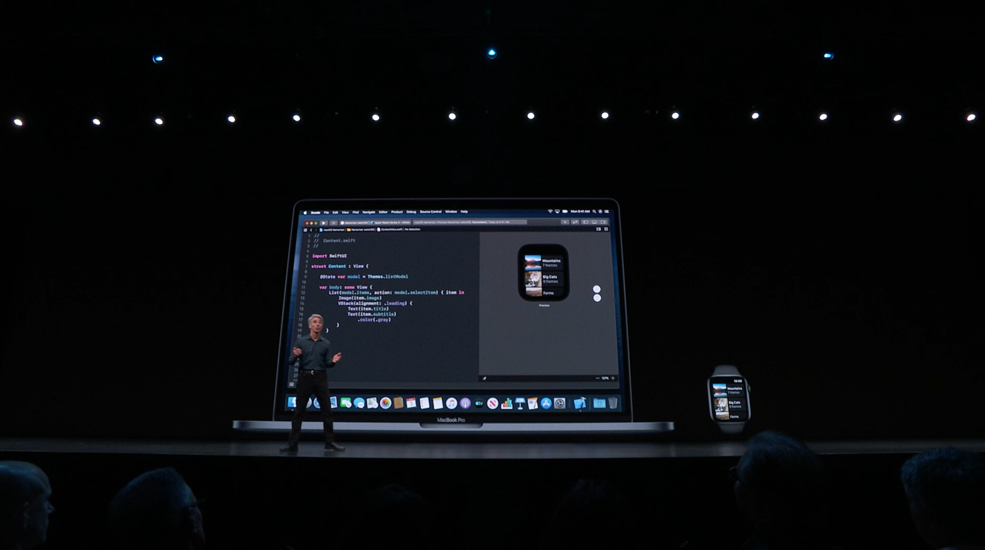 最後はSwift。Swift UIがアナウンス。すごく長ったらしい記述が必要だったリストが数行で。エディタ上で開発しながら操作して変更みれるしそのまま実機でもOK。ダークモードなどにも対応。ARKitなどもOK。Apple Watchも。全部Swiftで。![]()