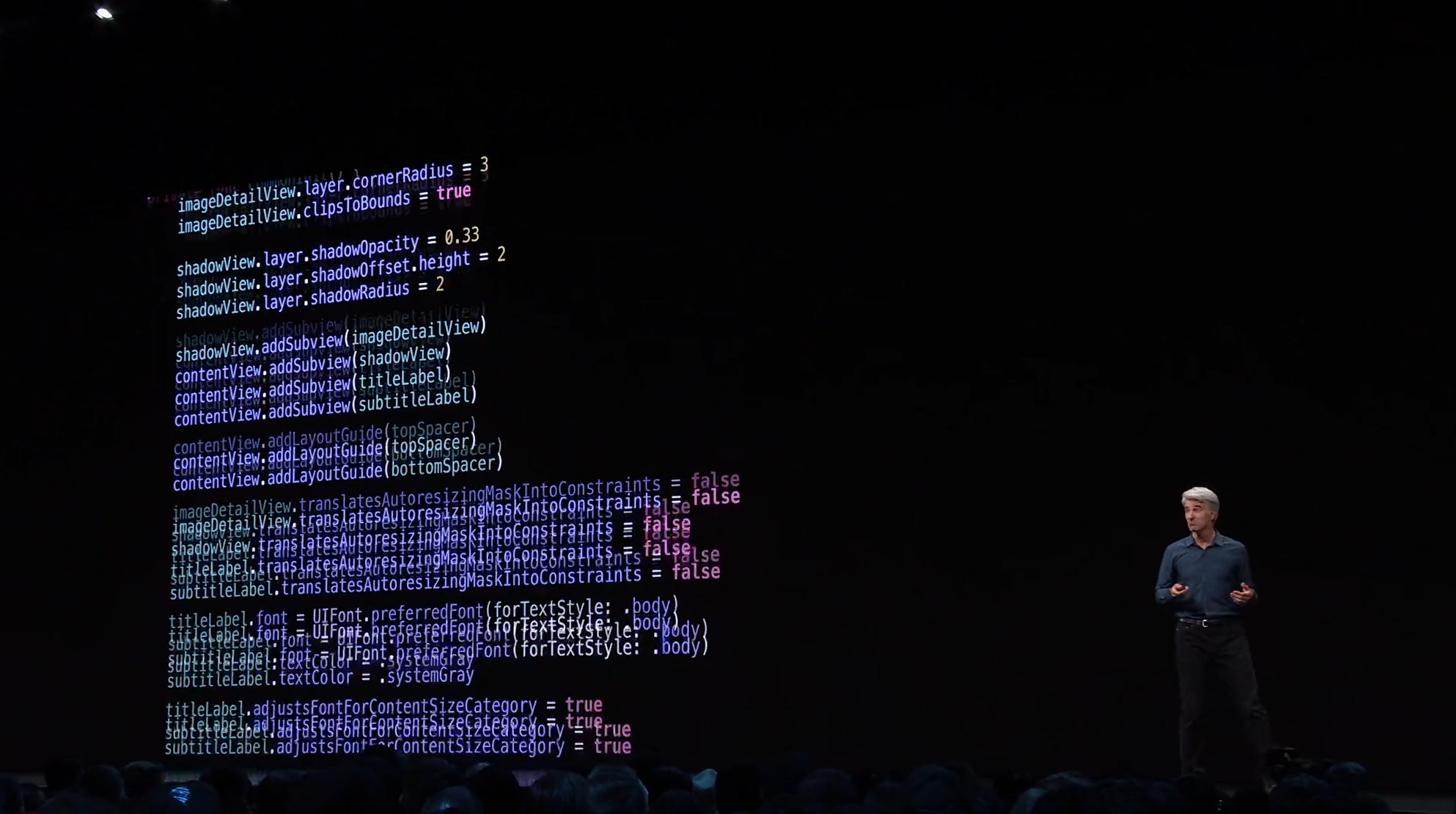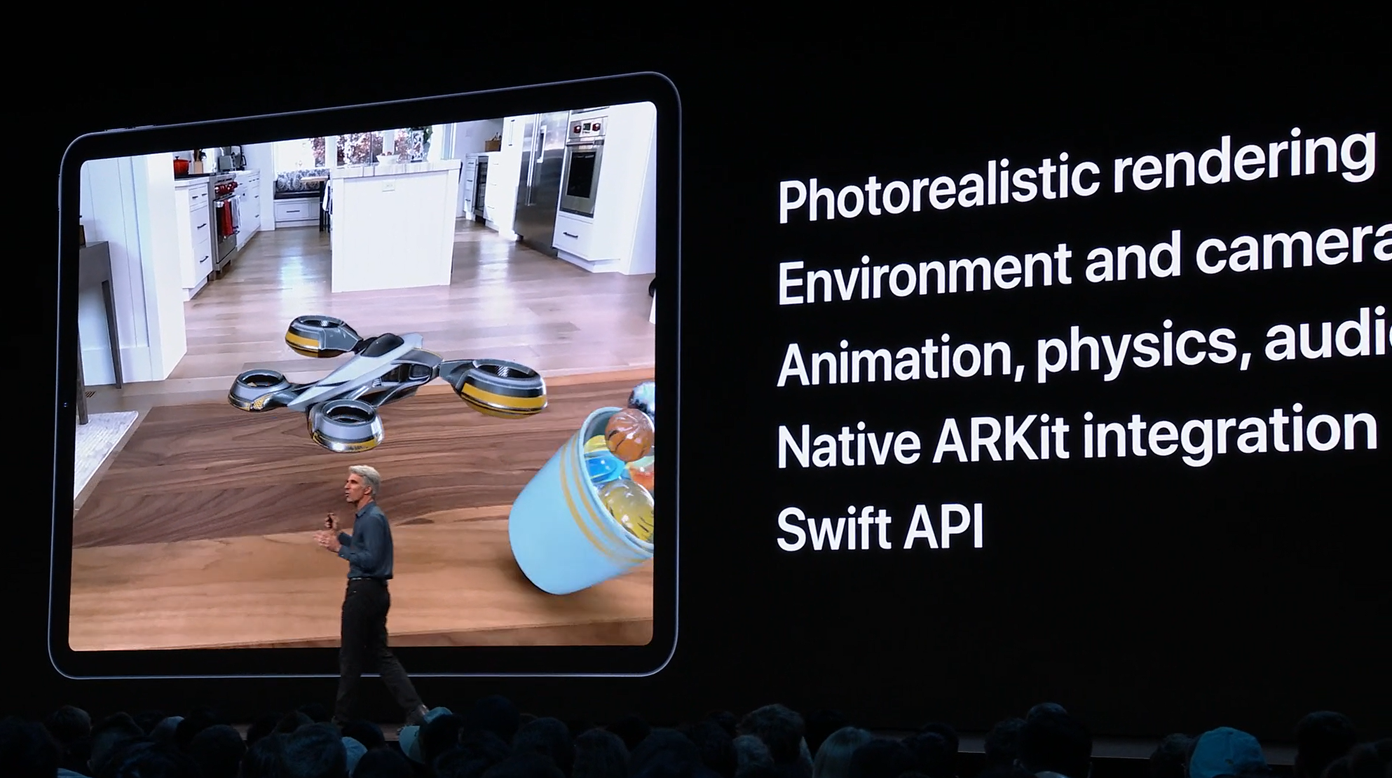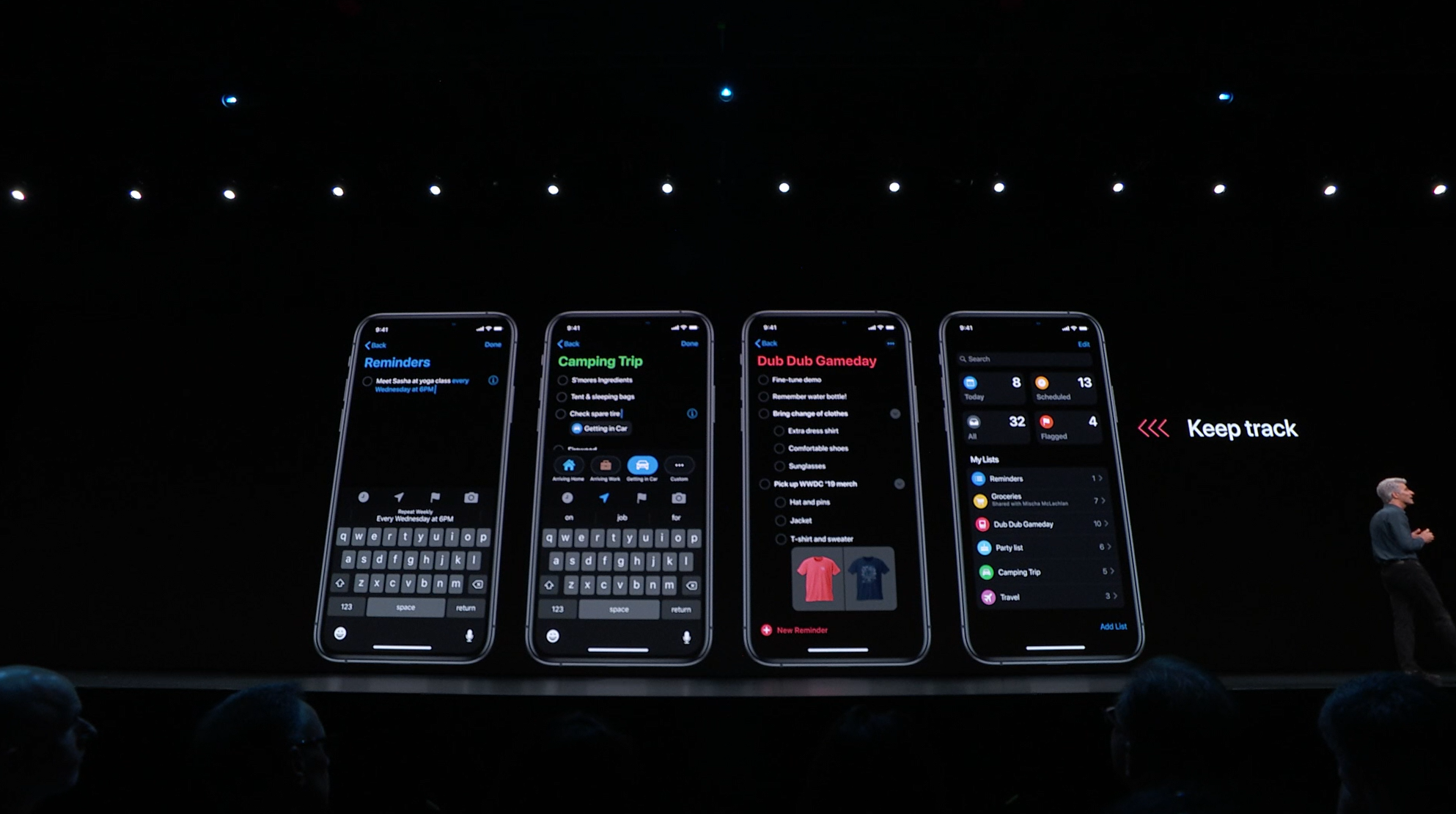 最後はSwift。Swift UIがアナウンス。すごく長ったらしい記述が必要だったリストが数行で。エディタ上で開発しながら操作して変更みれるしそのまま実機でもOK。ダークモードなどにも対応。ARKitなどもOK。Apple Watchも。全部Swiftで。![]()