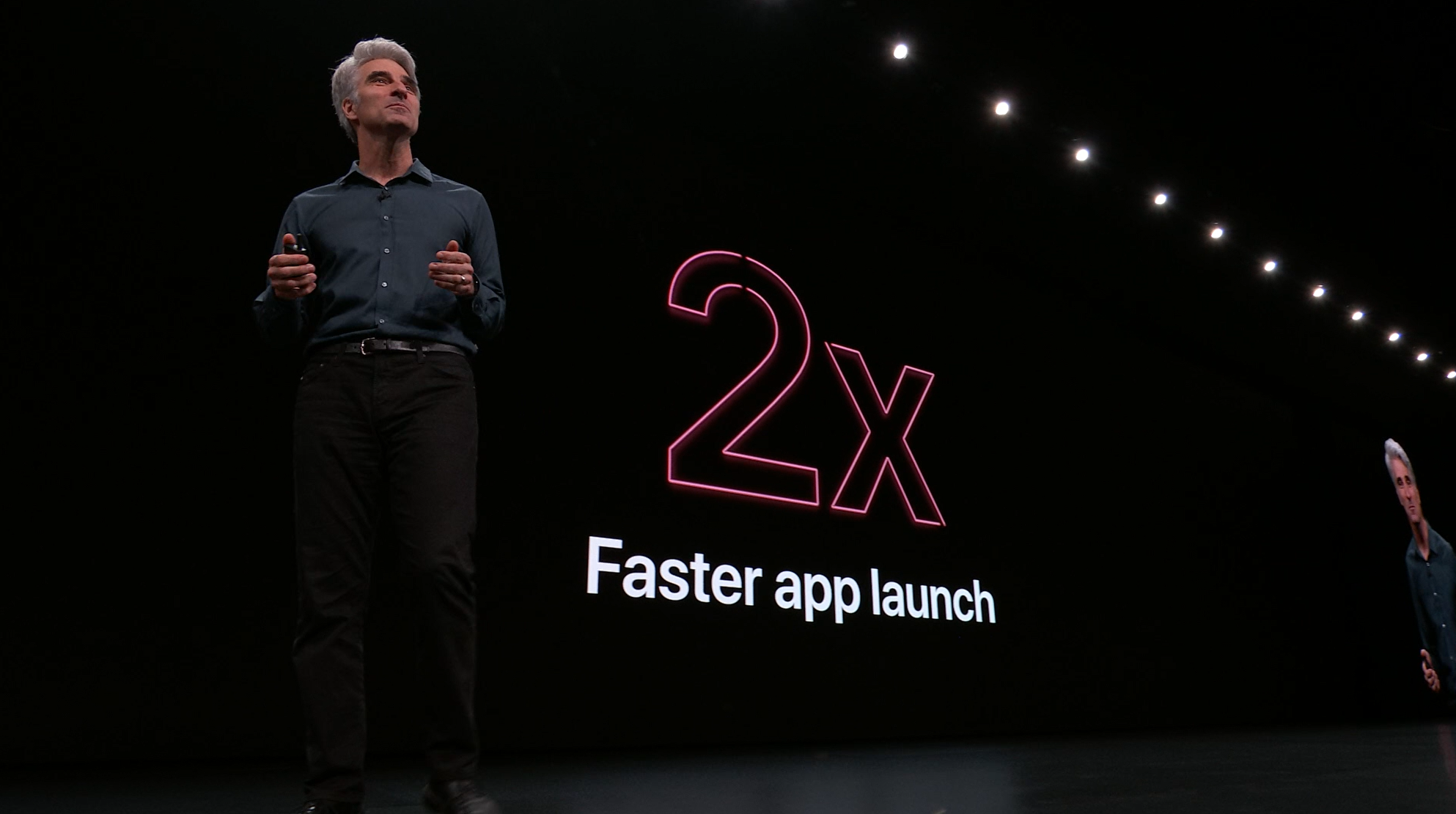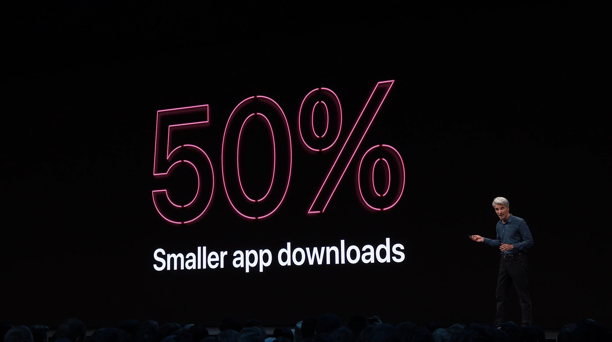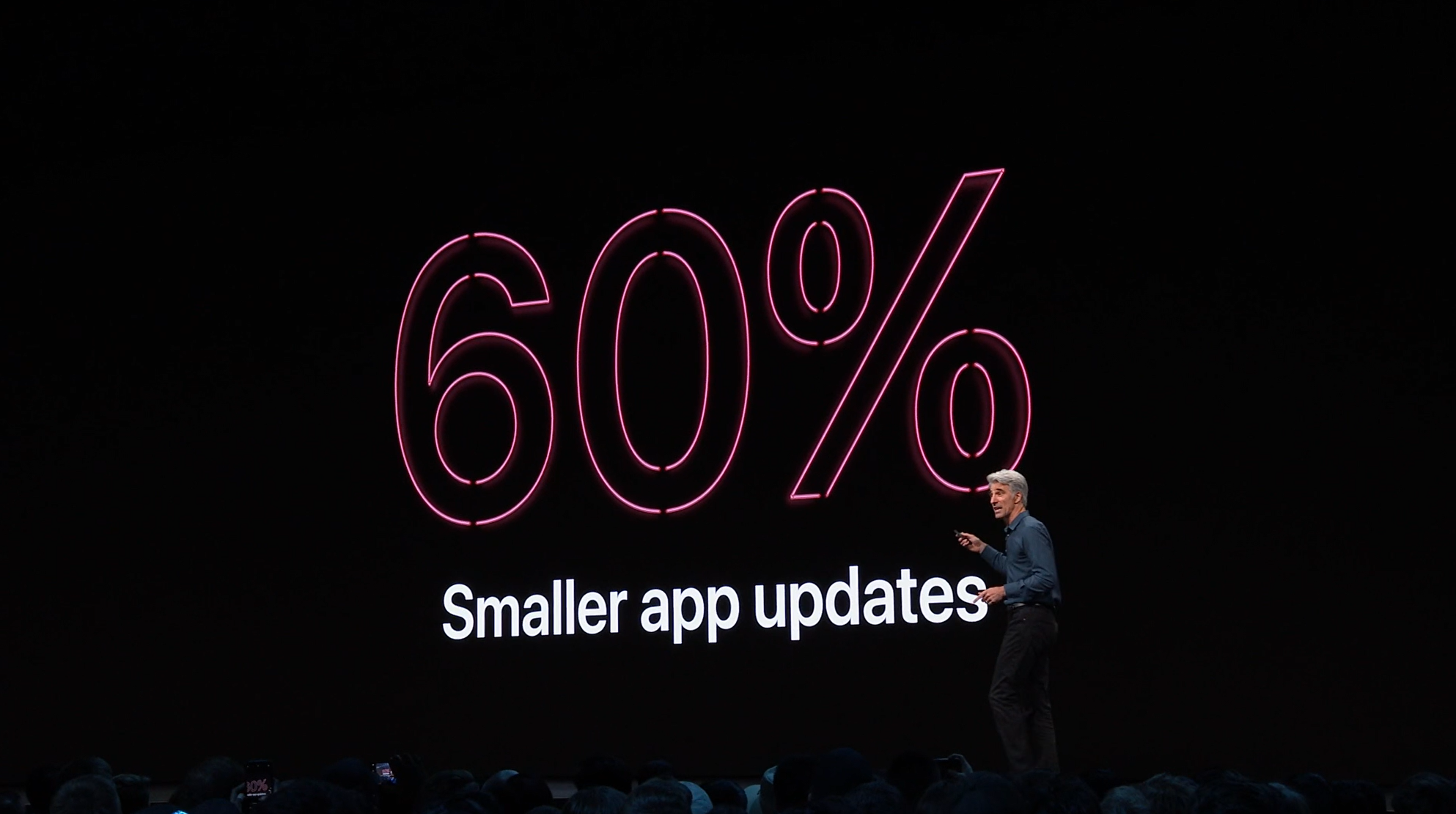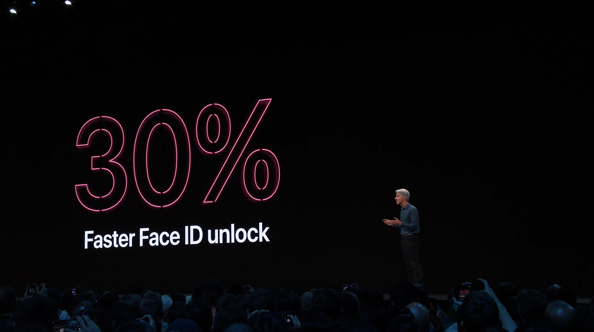 次はiOS。予想通りiOS13。Face IDを使ったアンロックが30%速くなるとかアプリの起動が2倍速くなるとかなんとか。![]()