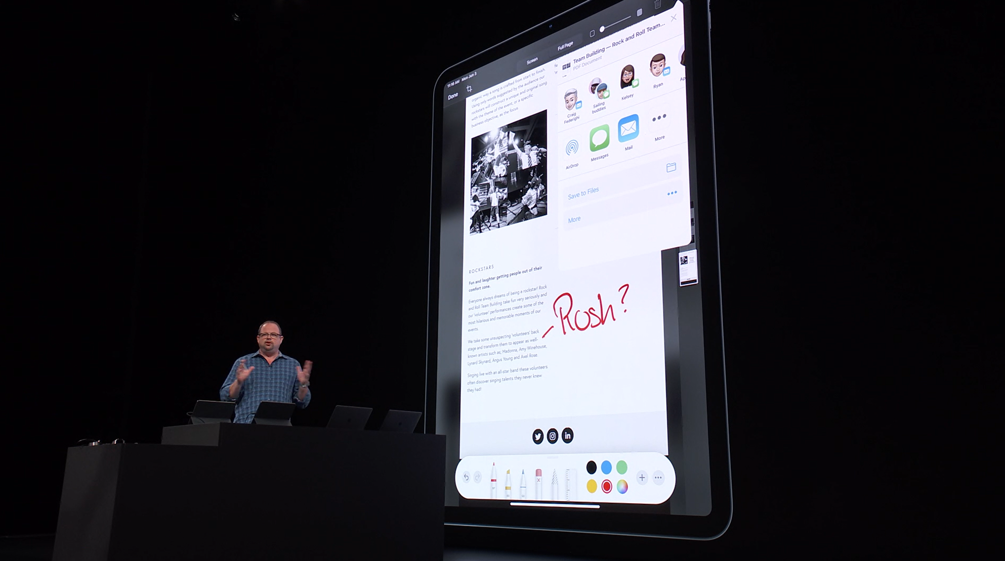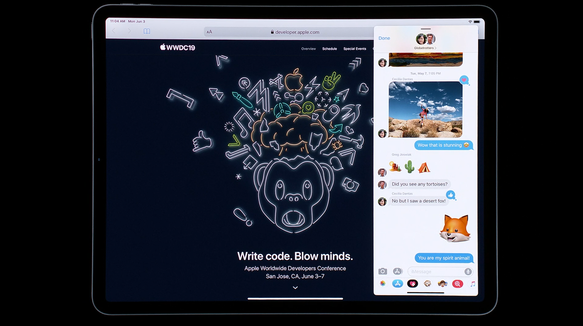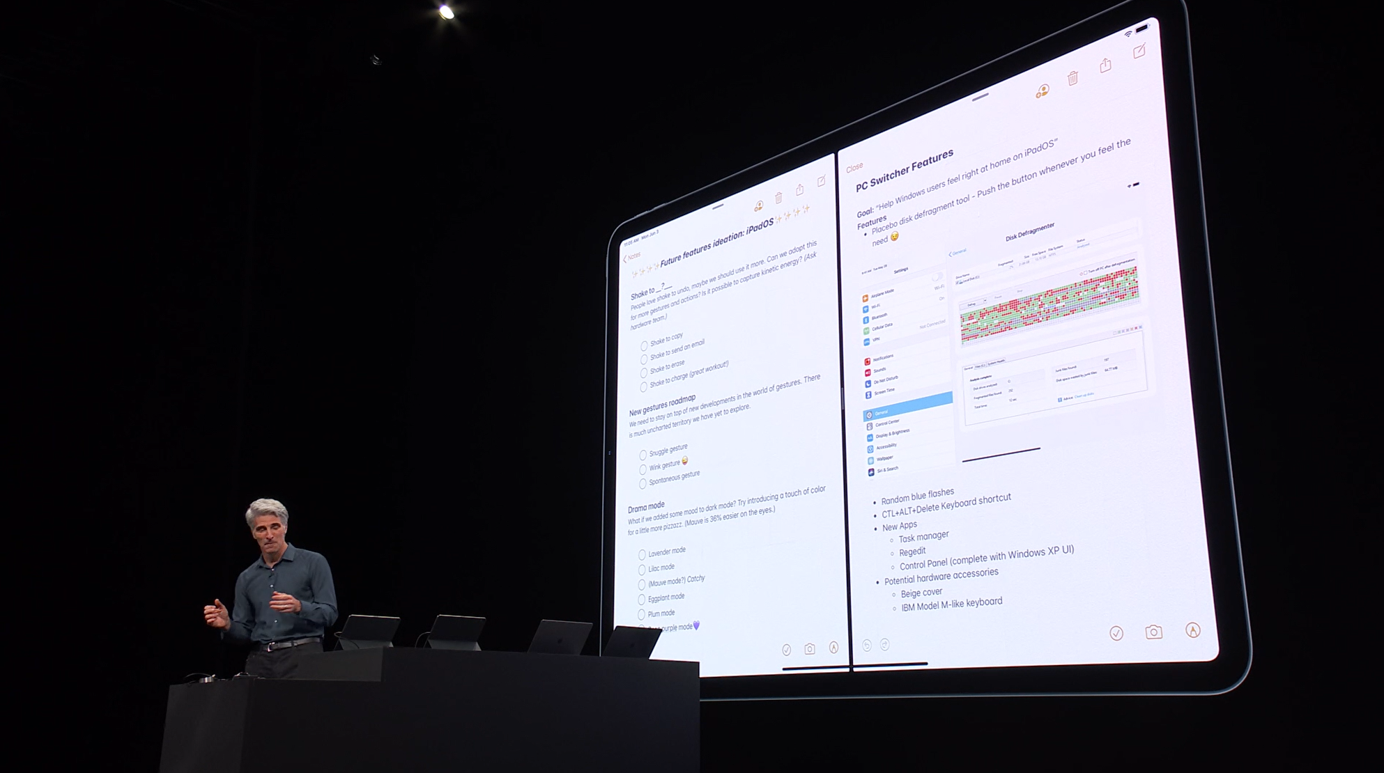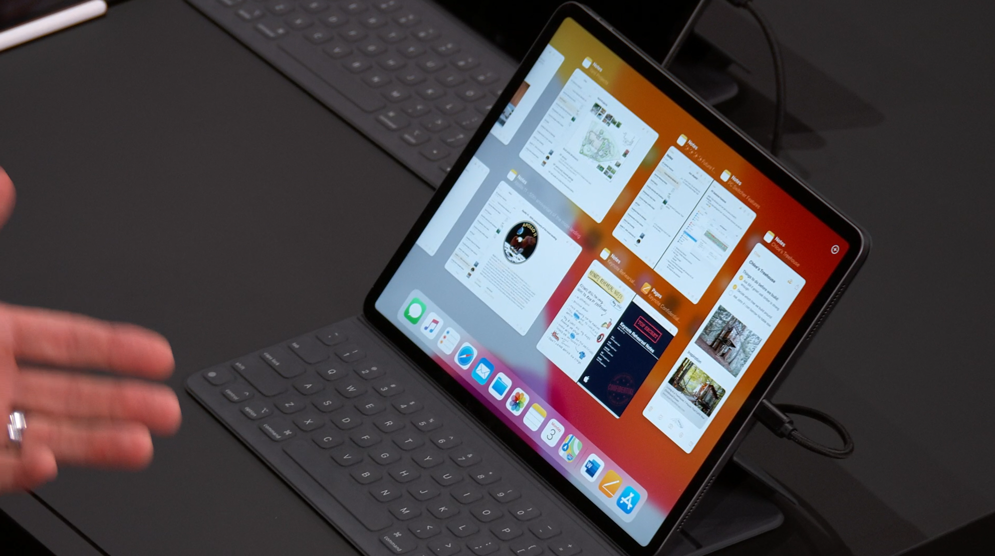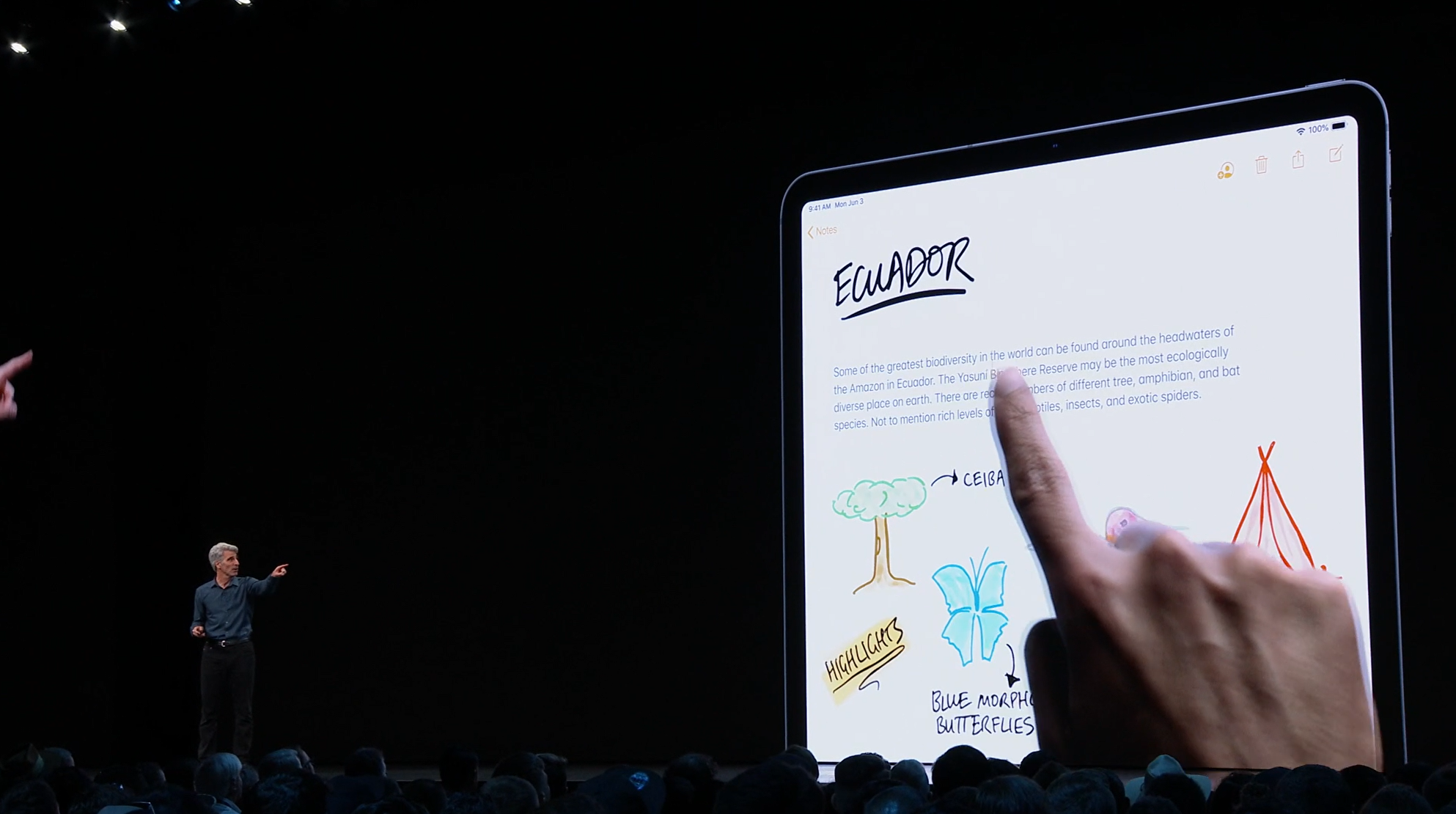 次はiPad。iPadOSがお披露目。iOS共通化とは…アプリの分割や切り替えなど大画面のiPadに適した機能が増えて特別になった感じ。メモを複数開いたり。Enterprise向けということでWord2枚とか出して失笑感あった。テキストも3本指ジェスチャーで切り取り・コピー・貼り付け・Undoなどなど。D&Dも。![]()
