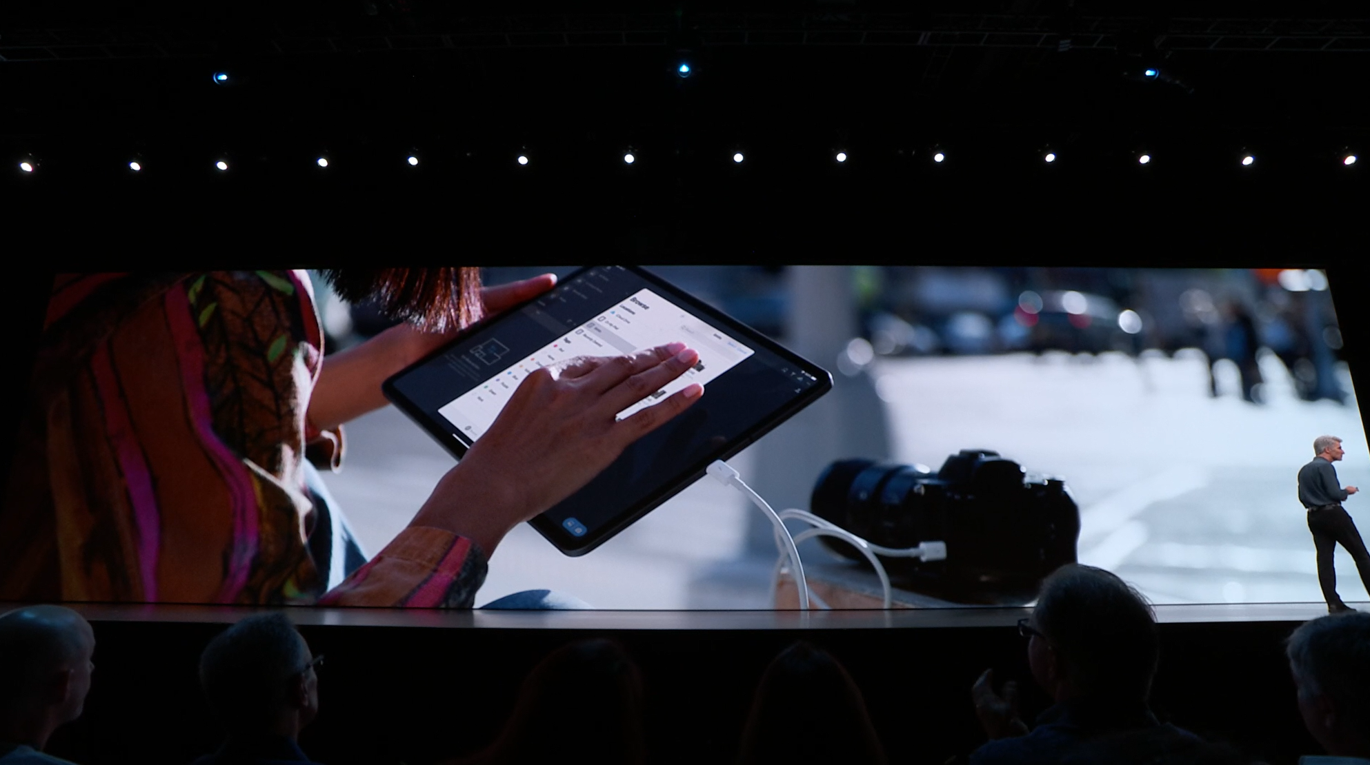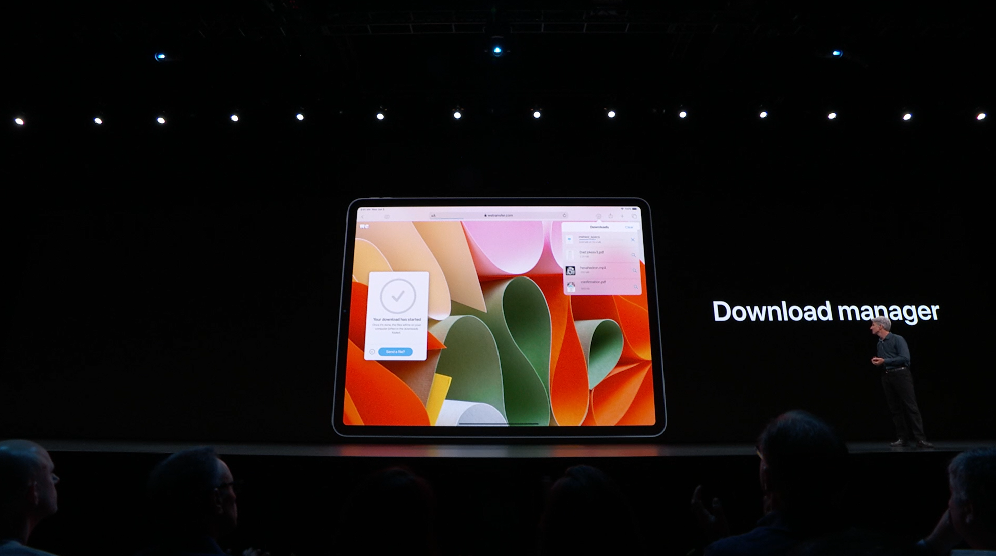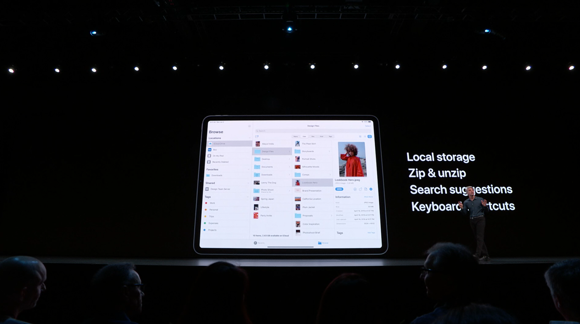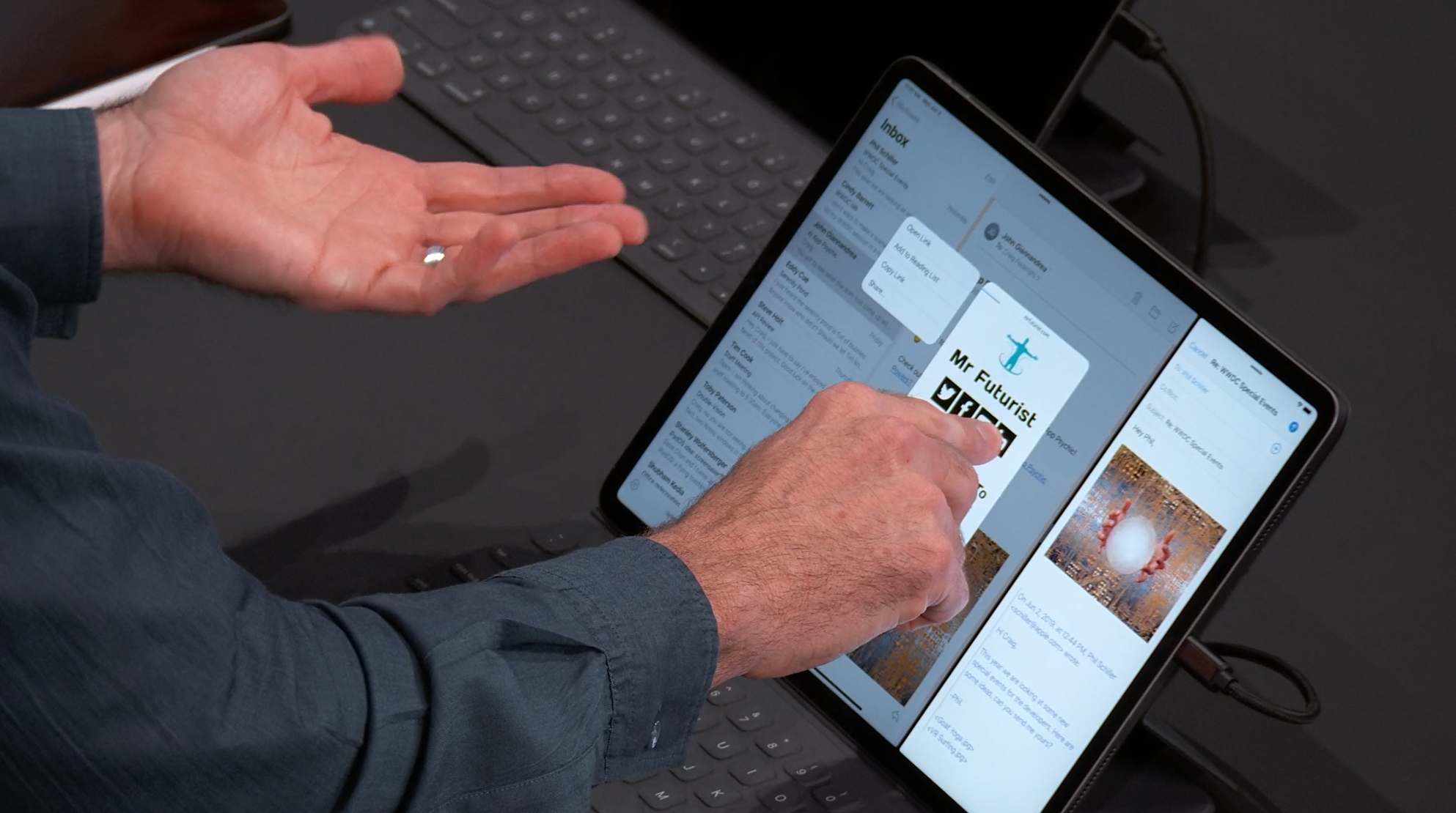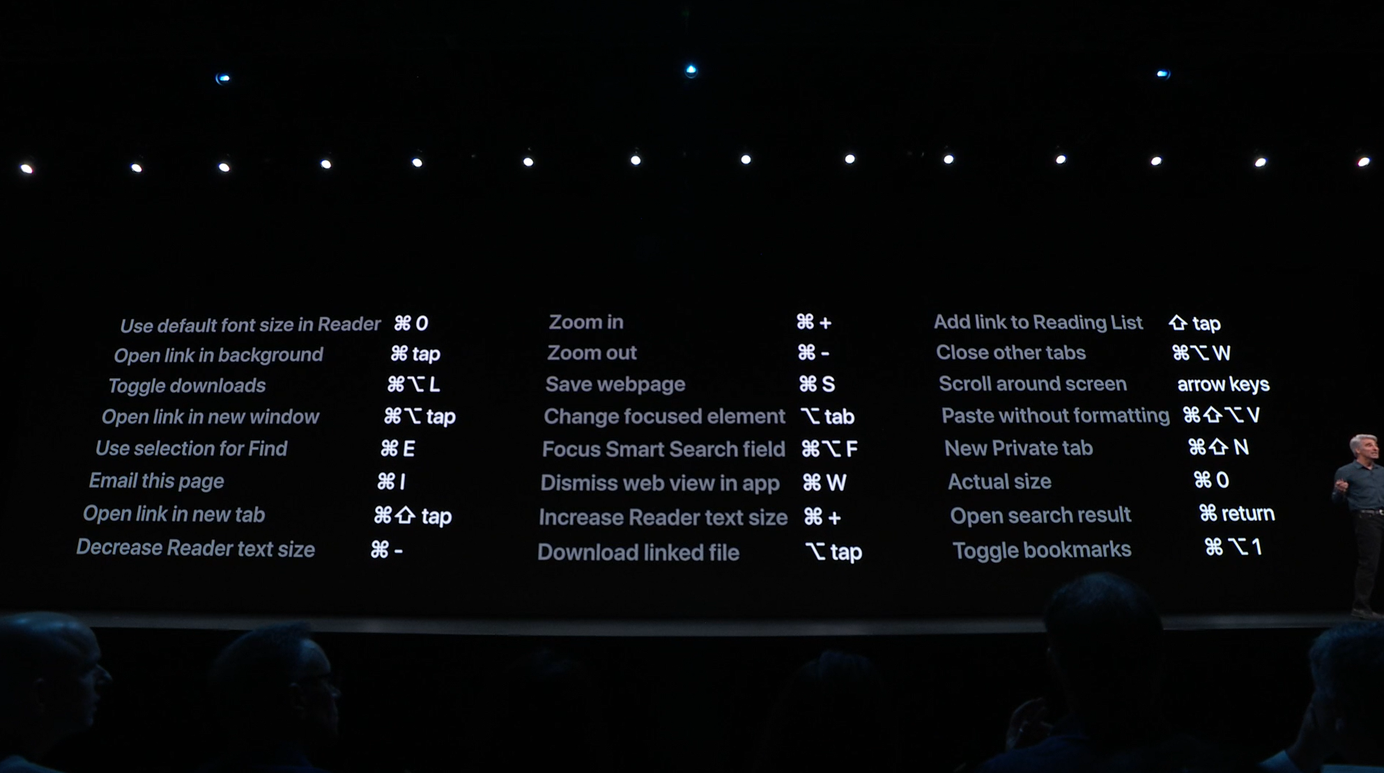 次はiPad。iPadOSがお披露目。iOS共通化とは…アプリの分割や切り替えなど大画面のiPadに適した機能が増えて特別になった感じ。メモを複数開いたり。Enterprise向けということでWord2枚とか出して失笑感あった。テキストも3本指ジェスチャーで切り取り・コピー・貼り付け・Undoなどなど。D&Dも。![]()