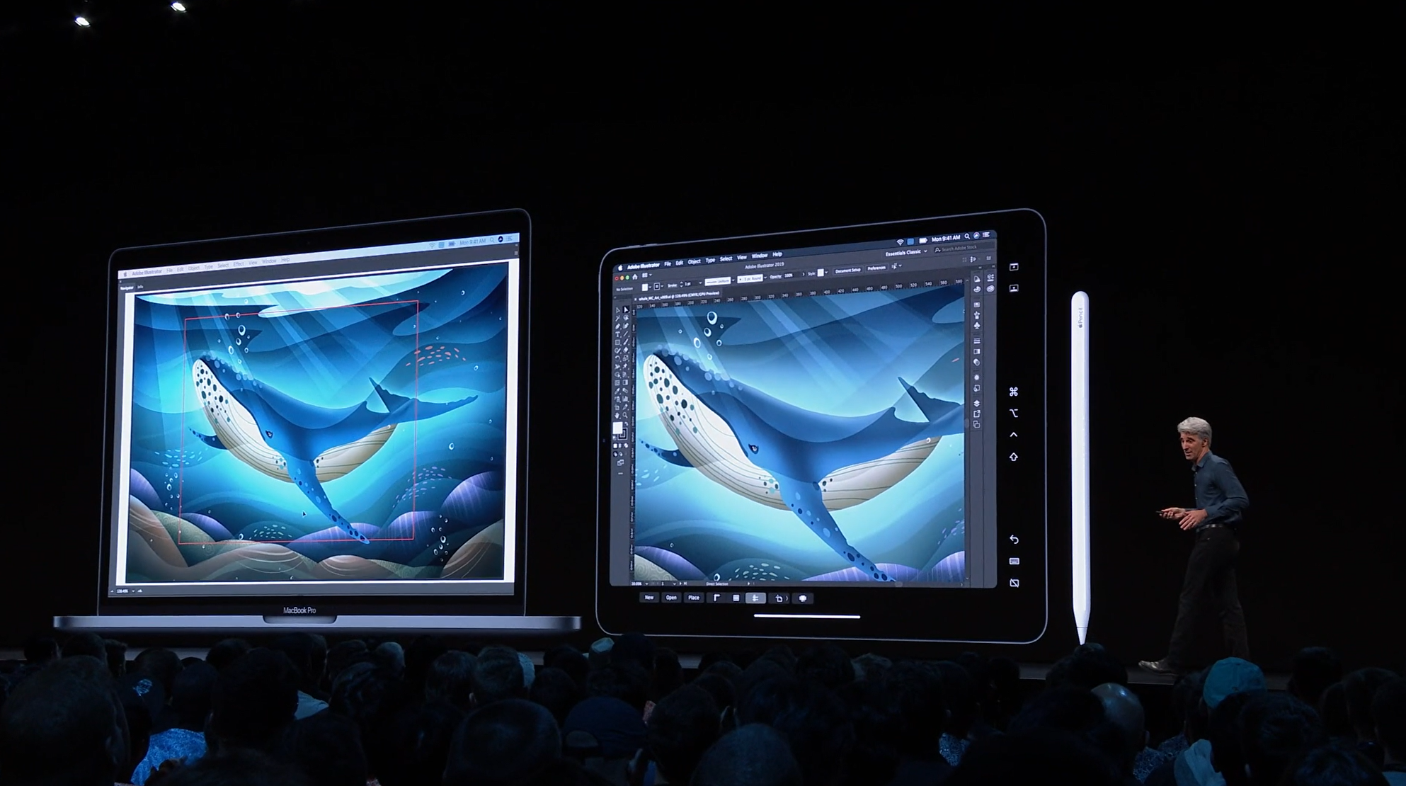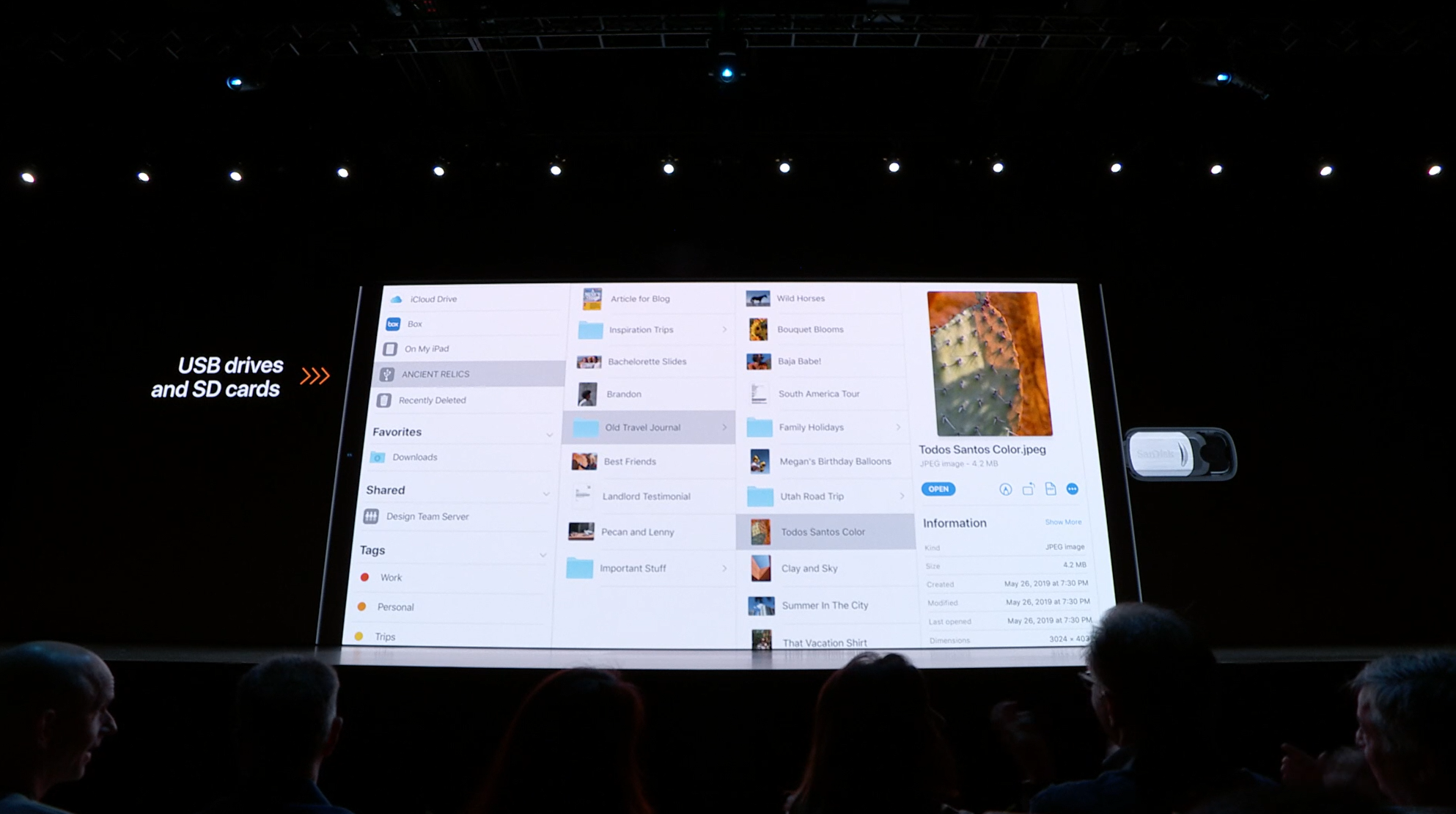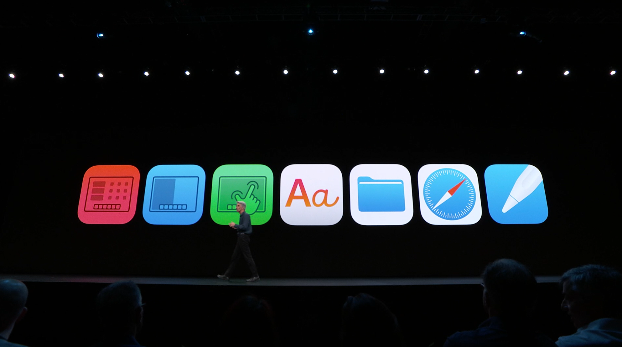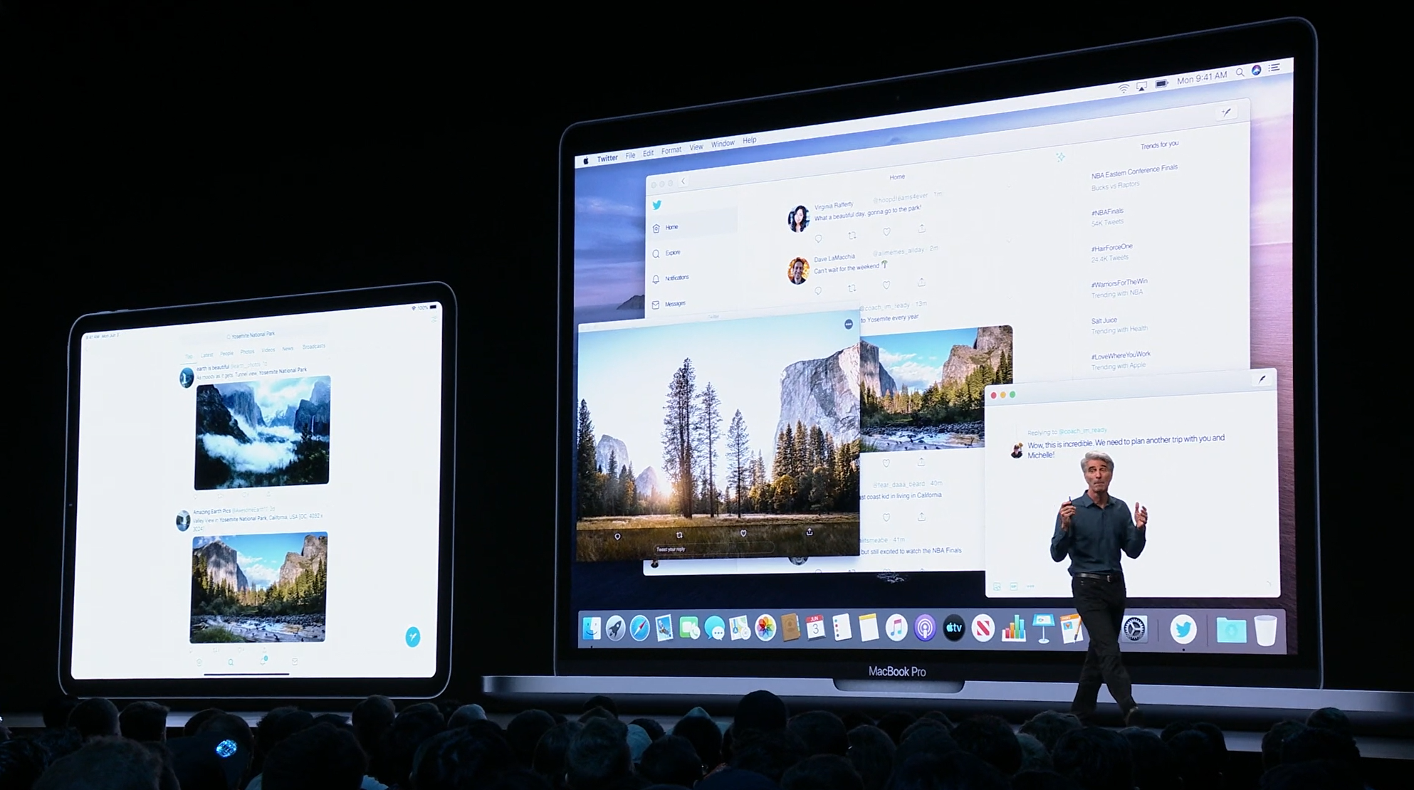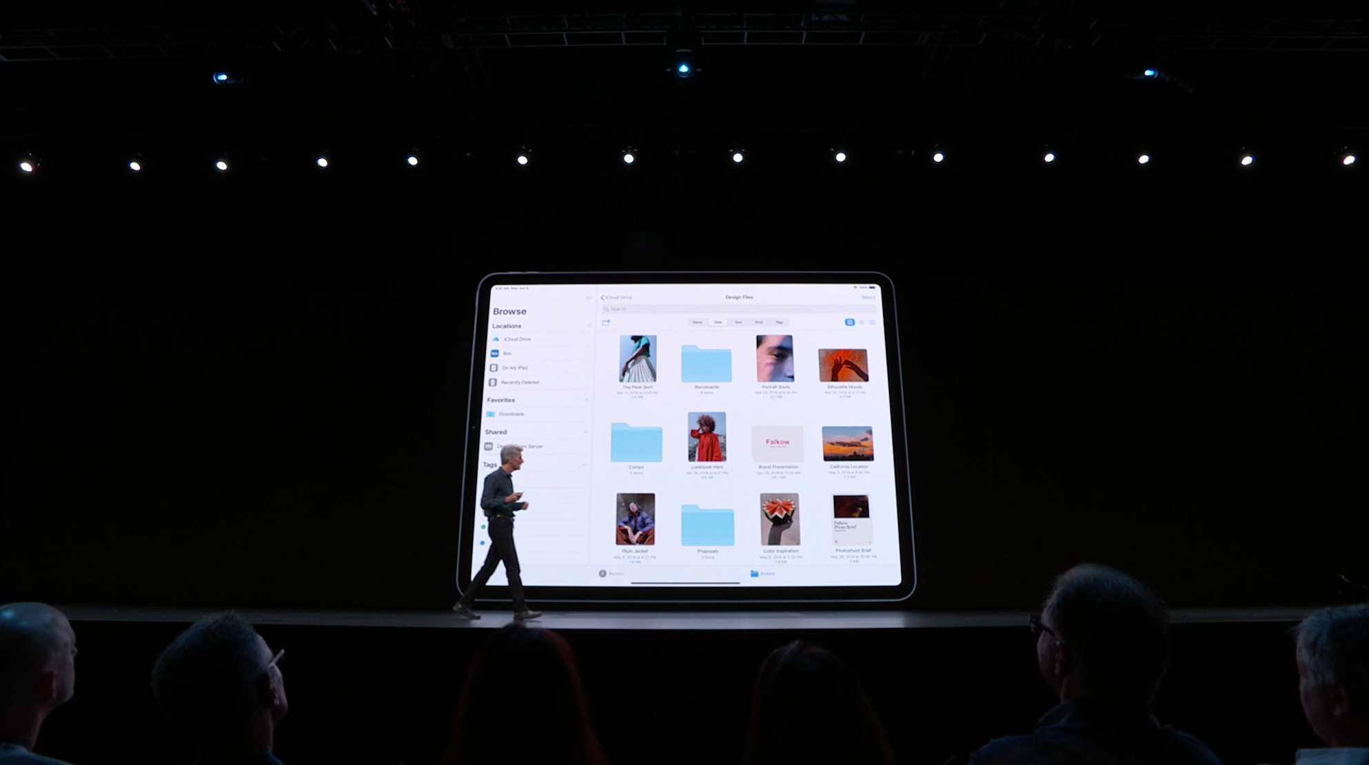 次はiPad。iPadOSがお披露目。iOS共通化とは…アプリの分割や切り替えなど大画面のiPadに適した機能が増えて特別になった感じ。メモを複数開いたり。Enterprise向けということでWord2枚とか出して失笑感あった。テキストも3本指ジェスチャーで切り取り・コピー・貼り付け・Undoなどなど。D&Dも。![]()