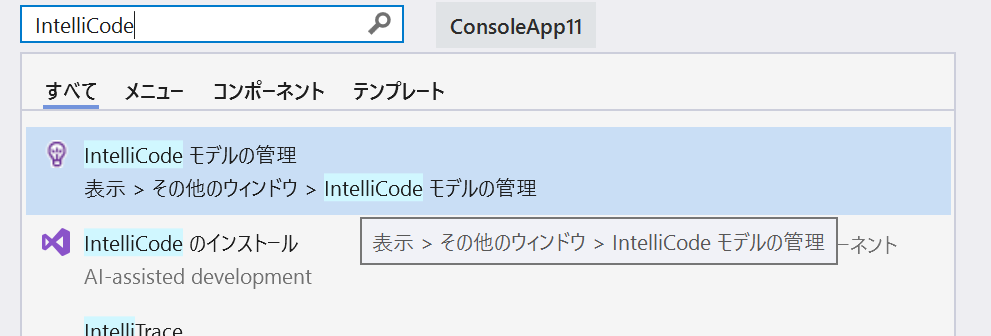 あと拡張機能が非同期ロードになったのでVisual Studio起動直後やソリューション開いた直後はうまく表示されなかったり、IntelliCode関連のメニューが表示されないかもしれません。しばらく待ちましょう。