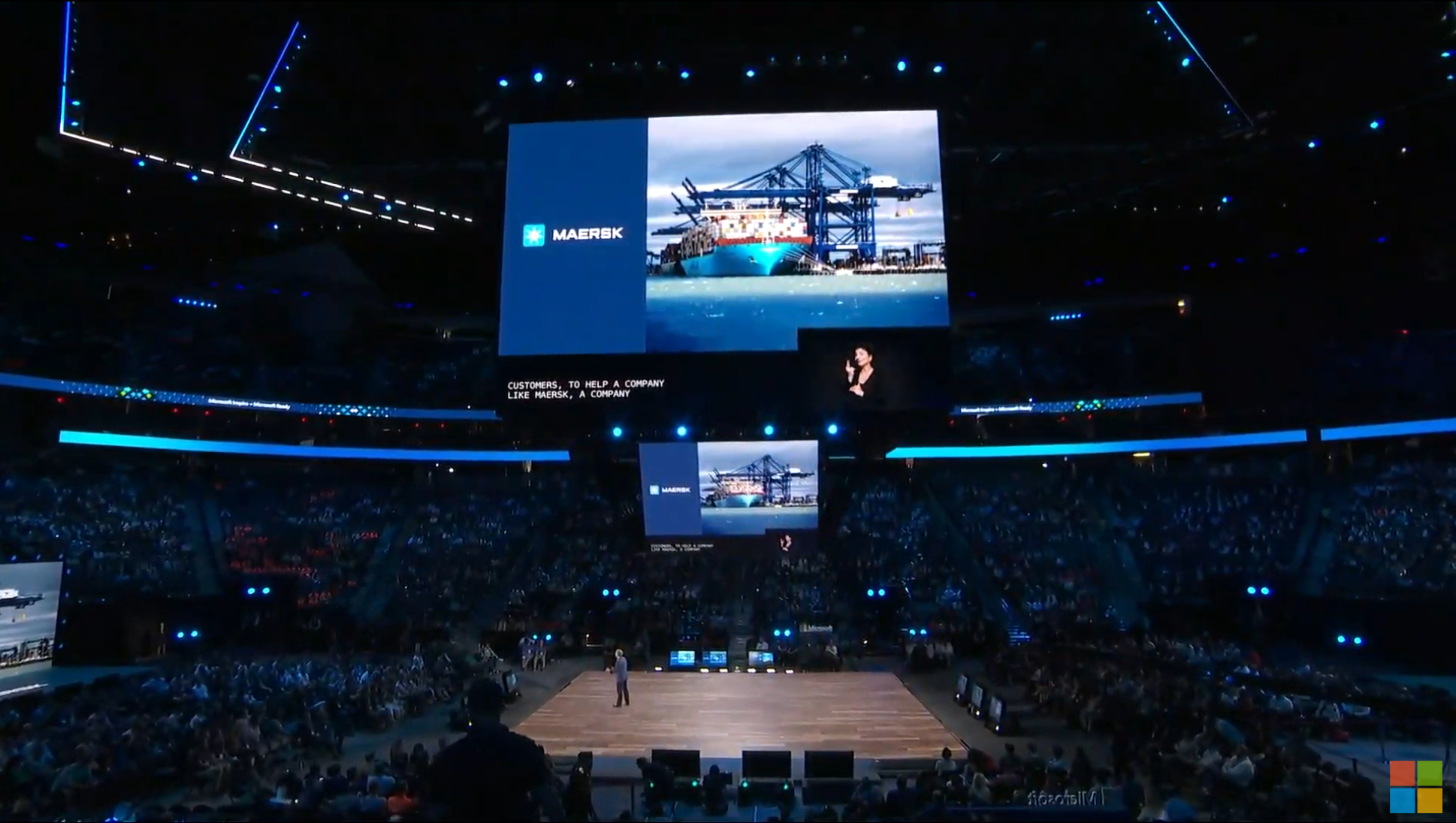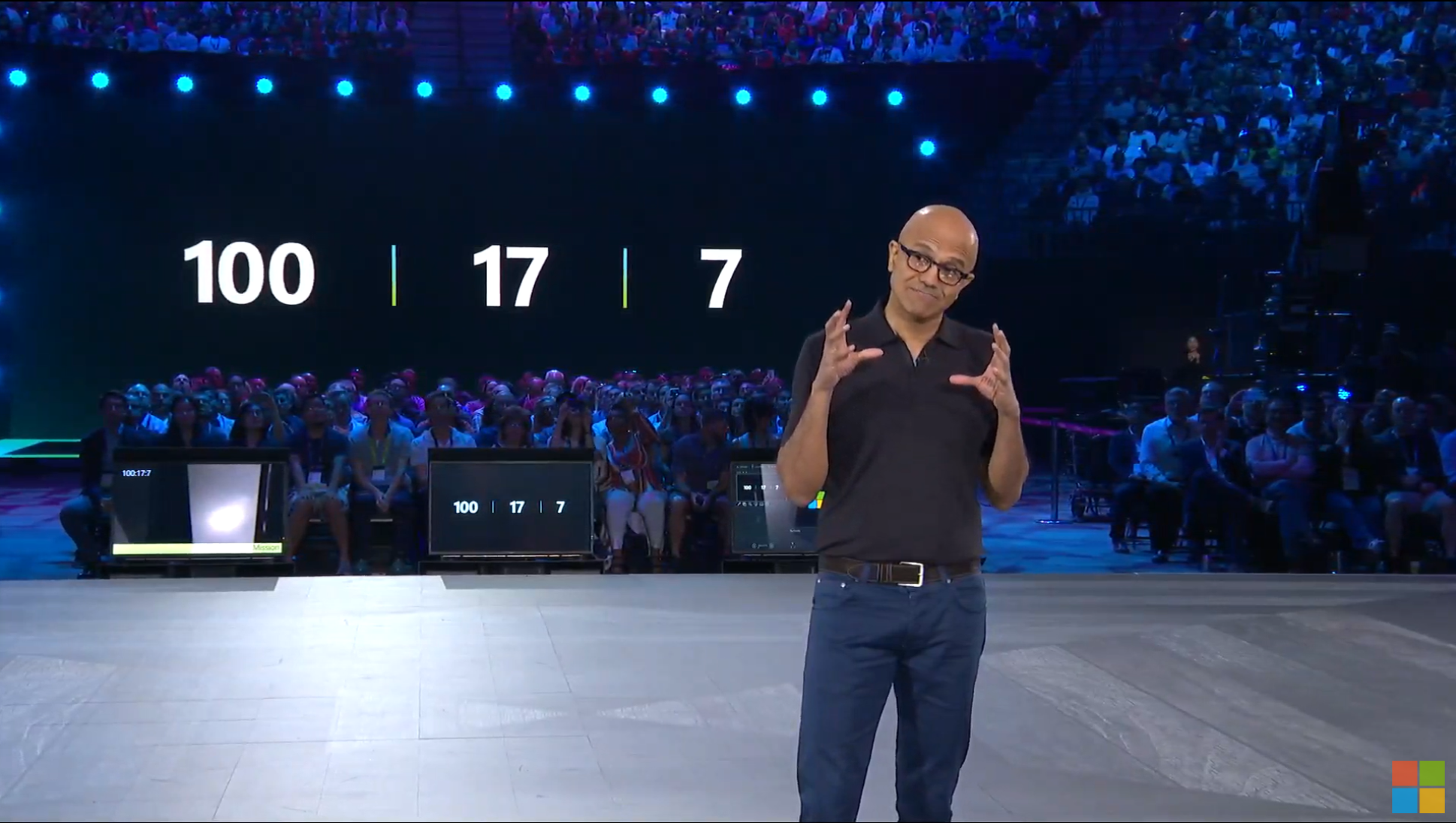 そしてSatya氏登場。今年は数字が大きなトピック。それぞれの数字にまつわる話で。10万人の社員、1700万人のパートナー、70億の地球上の人。2030年にはTechでグローバルなGDPが10%、非Techで90%になるぽい。