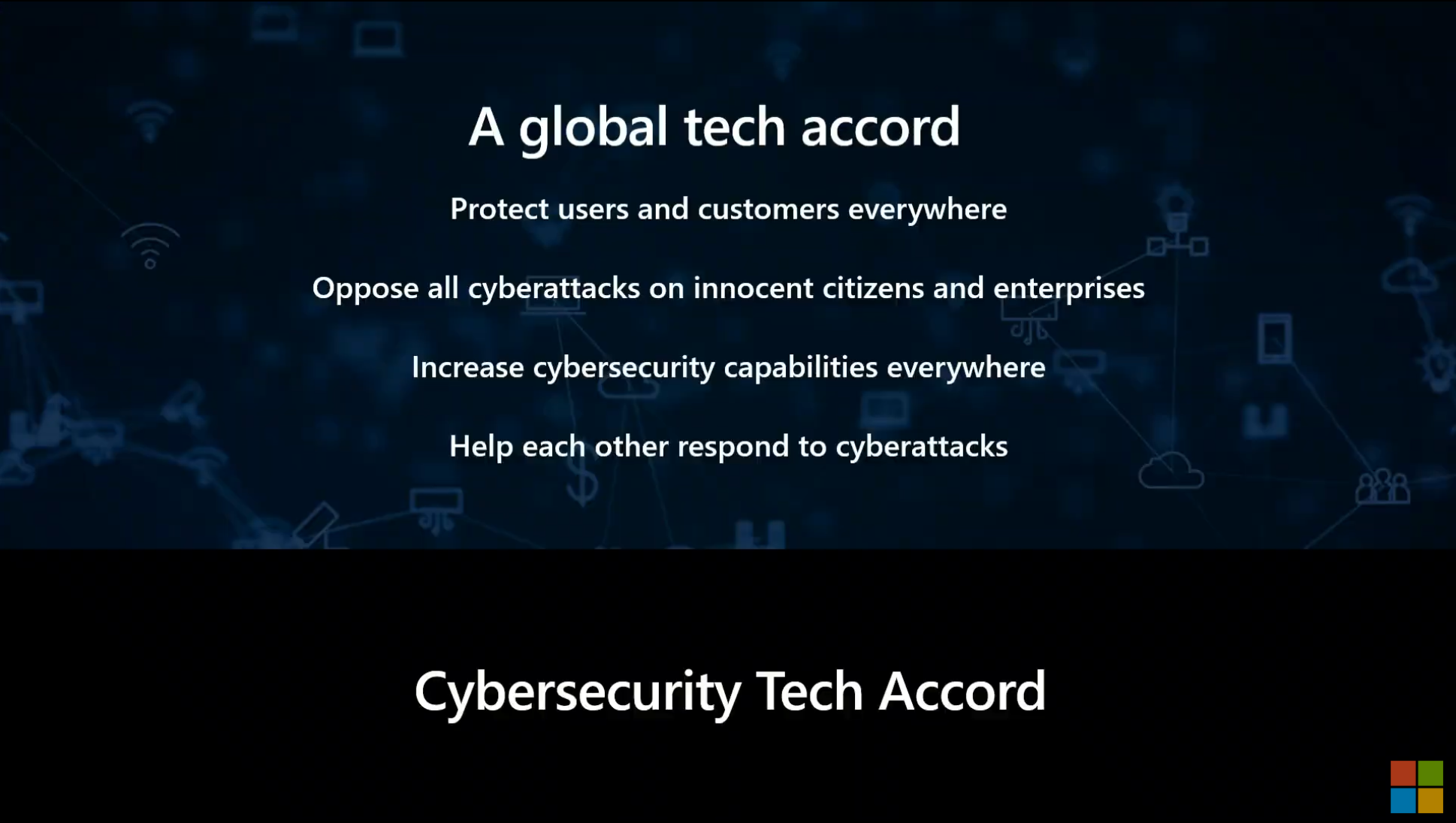 サイバーセキュリティーについてグローバルな技術協定。パリでは信頼と安全を求めて市民の保護、選挙の保護、インターネットの保護を。電子空間での信頼とセキュリティについてパリの呼びかけに66政府(日本含む)が署名。他にも139の市民団体、347の業界からも署名が。