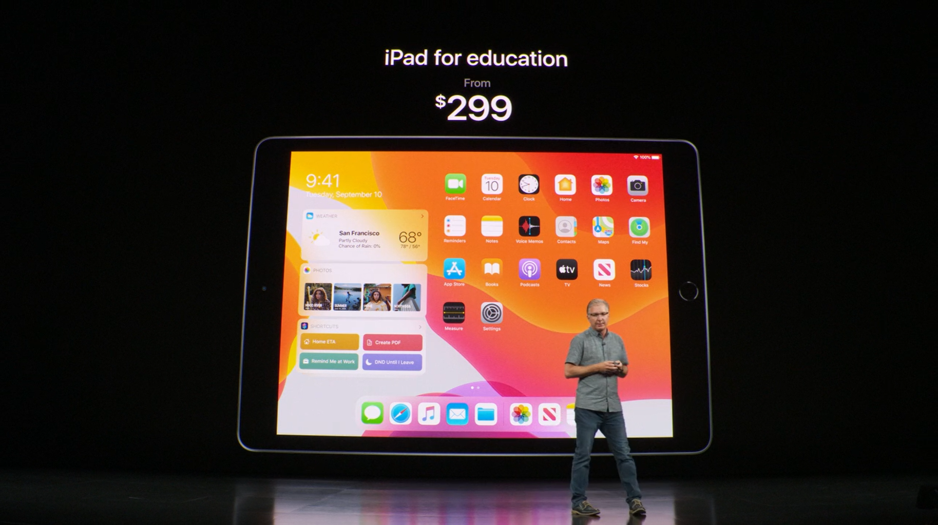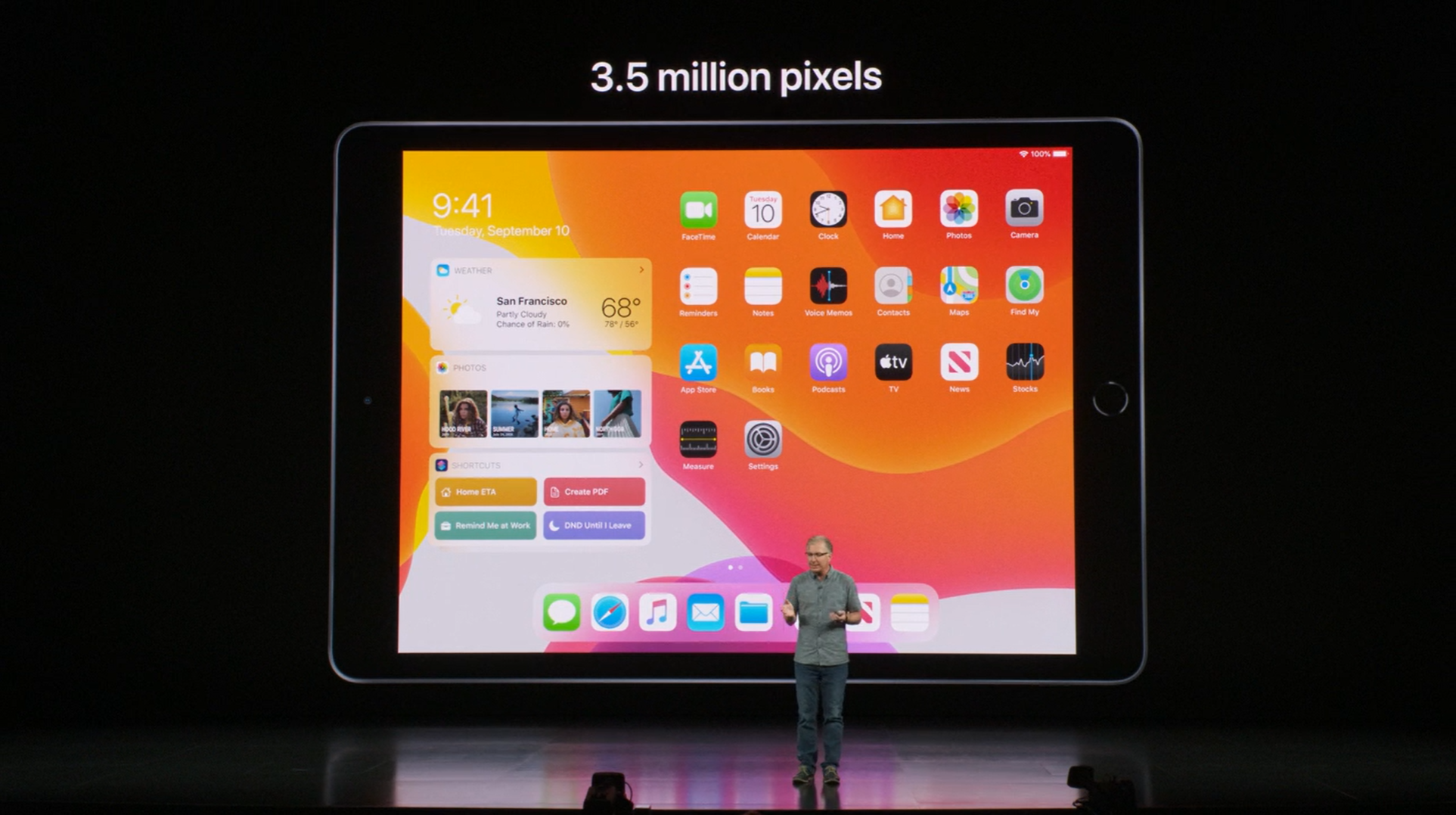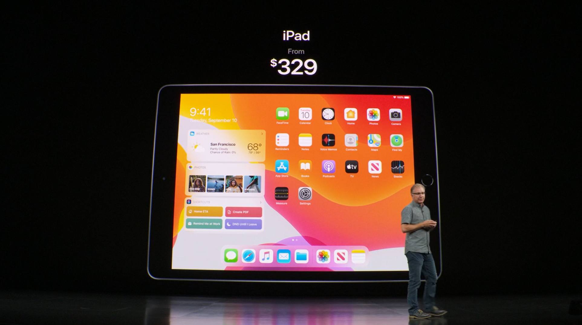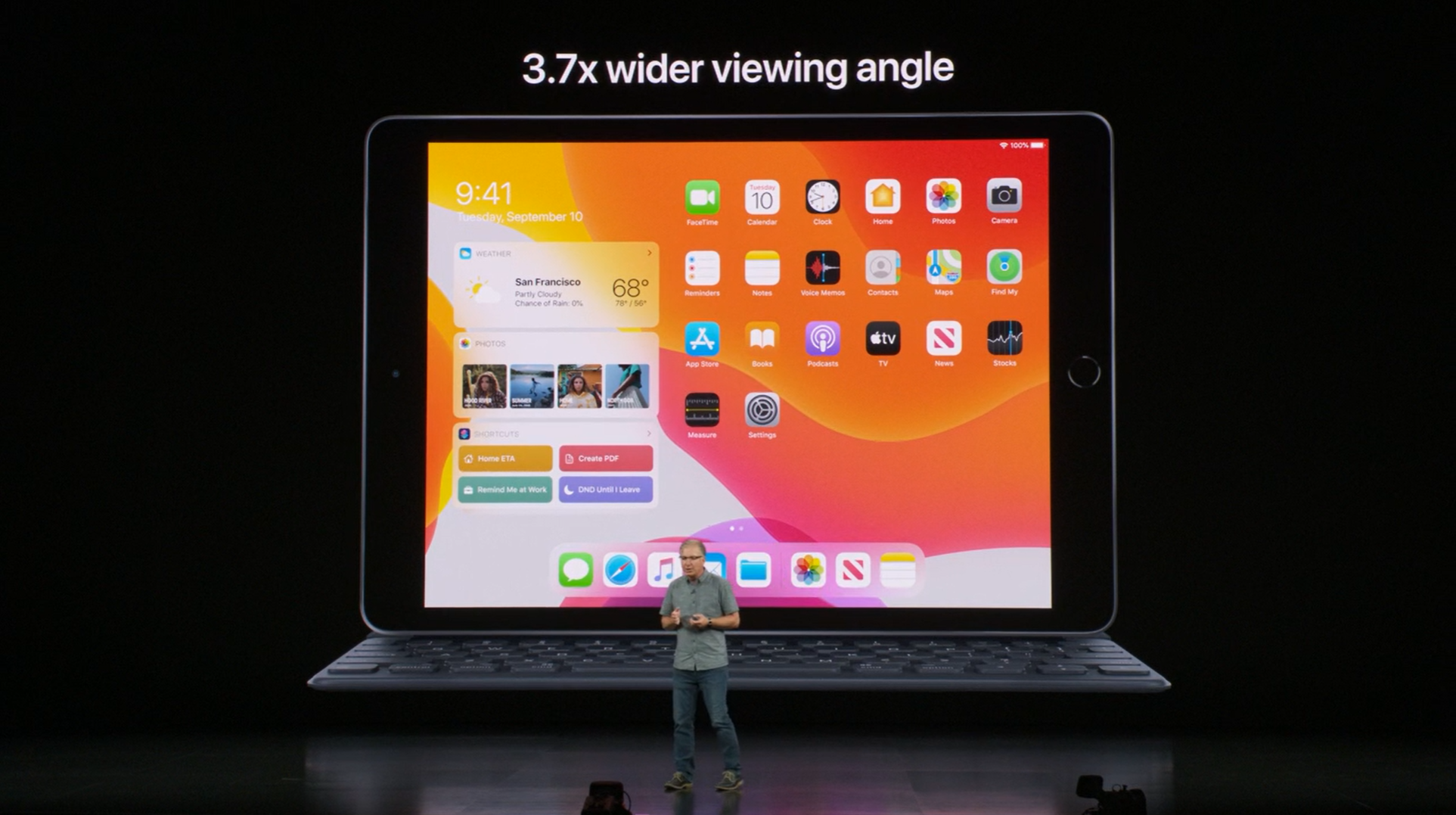 TVの次はiPad。iPadOSは今ベータで出てますね。ということで第7世代iPad。10.7インチ。PCなラップトップより2倍速いとかなんとか。マルチタスキングもあるよ。Apple Pencileもサポート(第1世代ぽい?)。100%リサイクルアルミ。329ドルだそうだ。Education向けはさらにお安く。今日からプレオーダーで30日に出荷。![]()