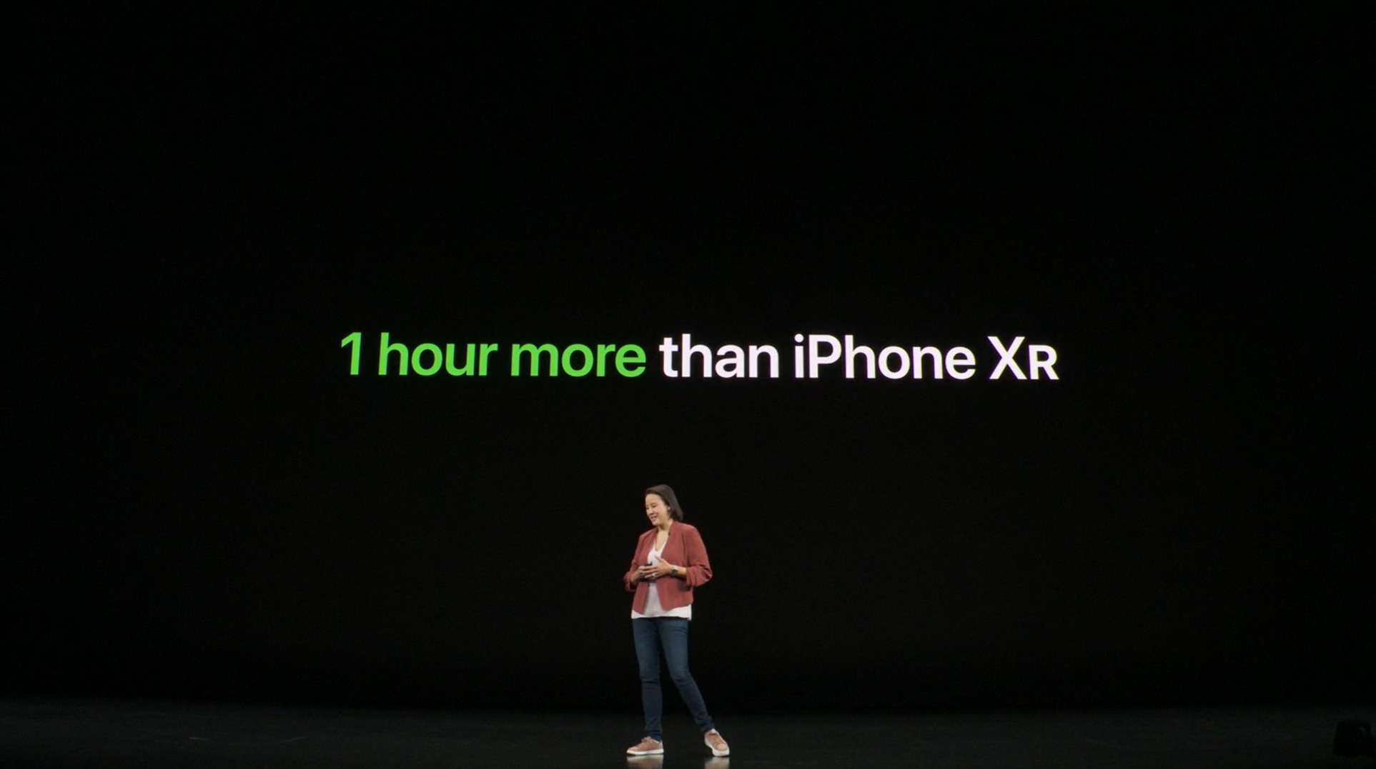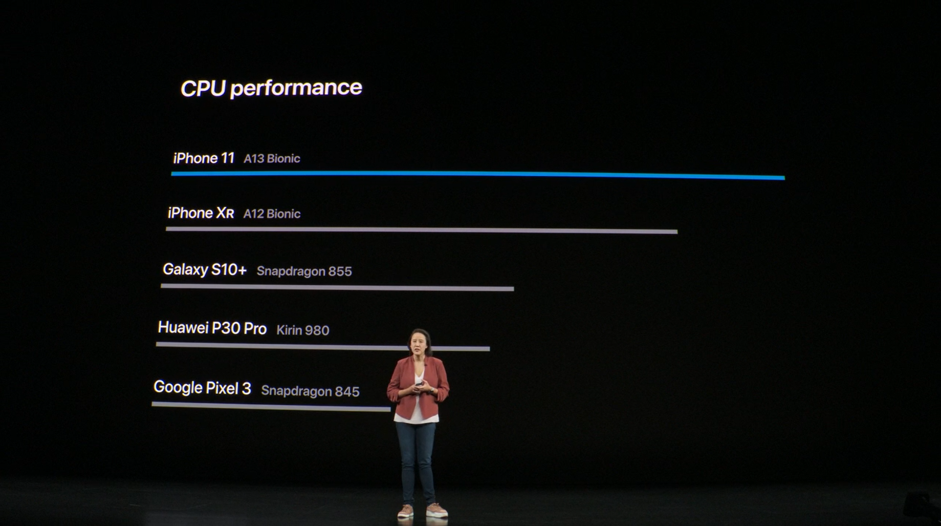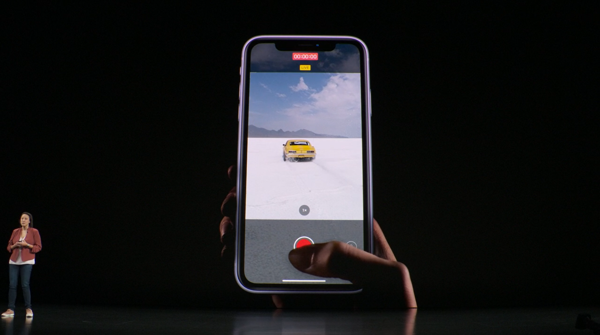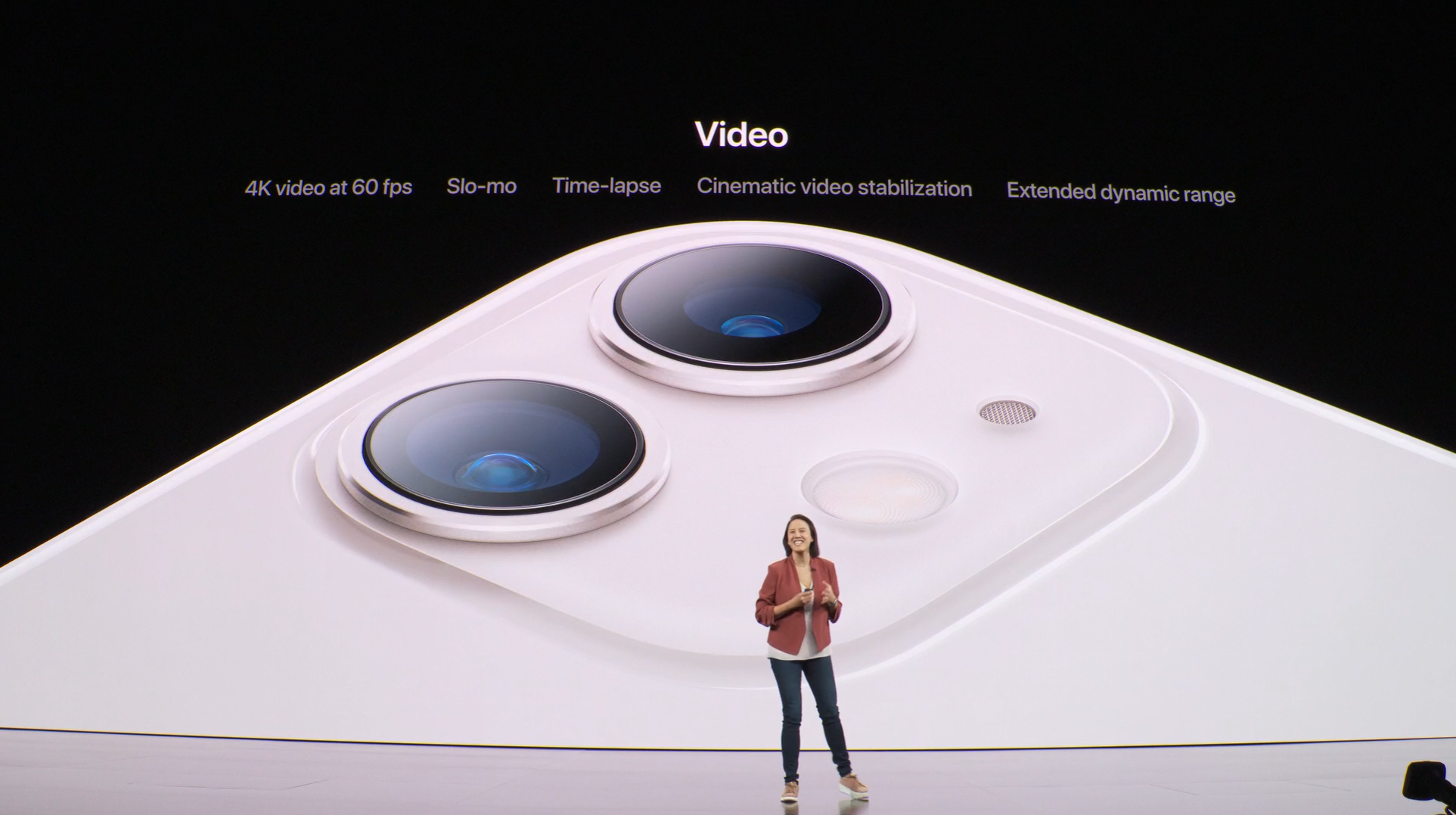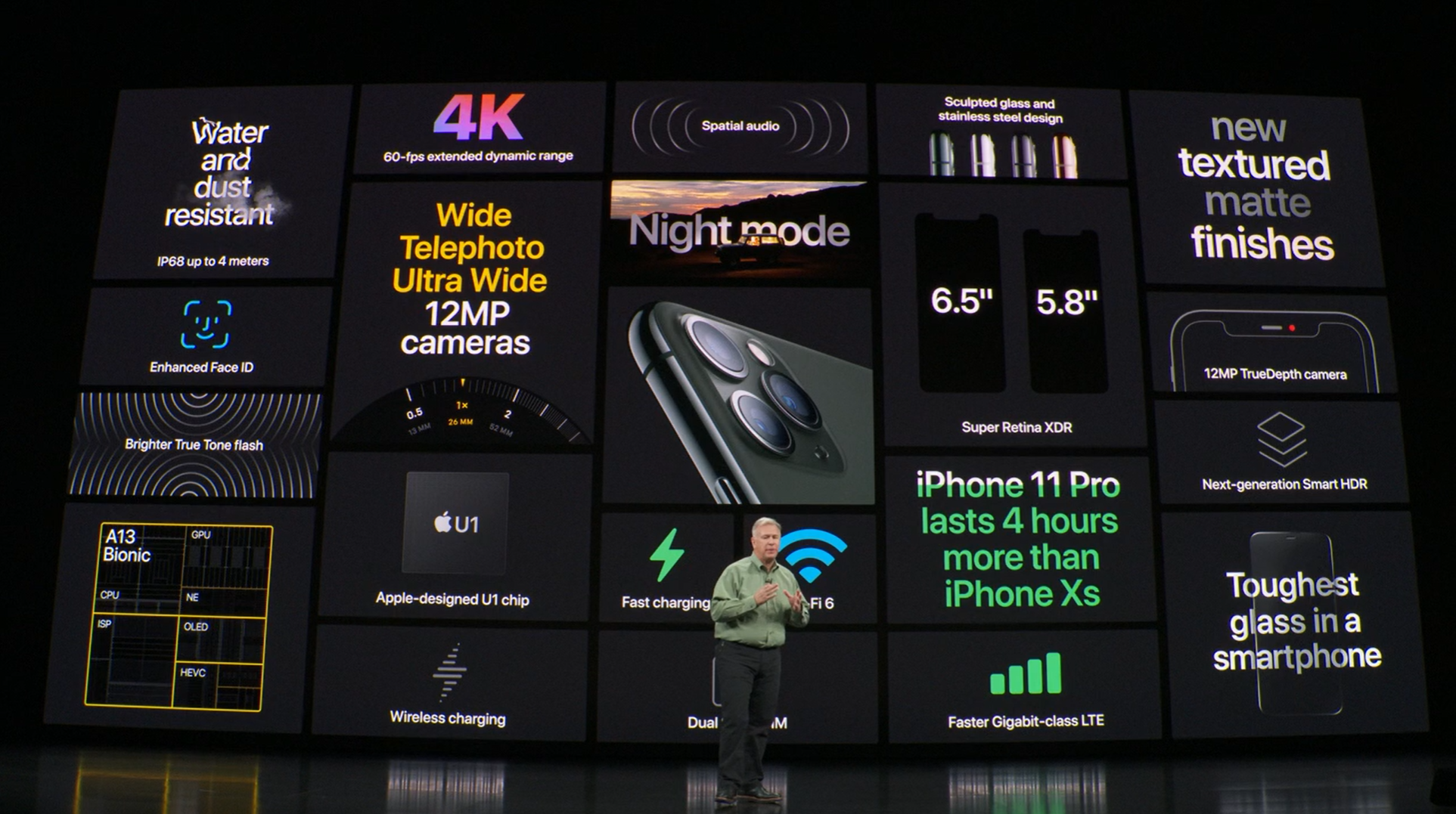 さてiPhoneの出番。顧客満足度99%らしい。ということで新しいiPhone 11。カラバリは6種類。ディスプレイは6.1インチ。カメラは2つ。背景消したりナイトモードとか。QuickTakeは写真でシャッター長押しで動画録画になるとか。スローモーションも上手に撮れるよ。チップは新しいA13かな。CPUもGPUも現行で一番速いとアピール(評価方法はよくわからない)。![]()