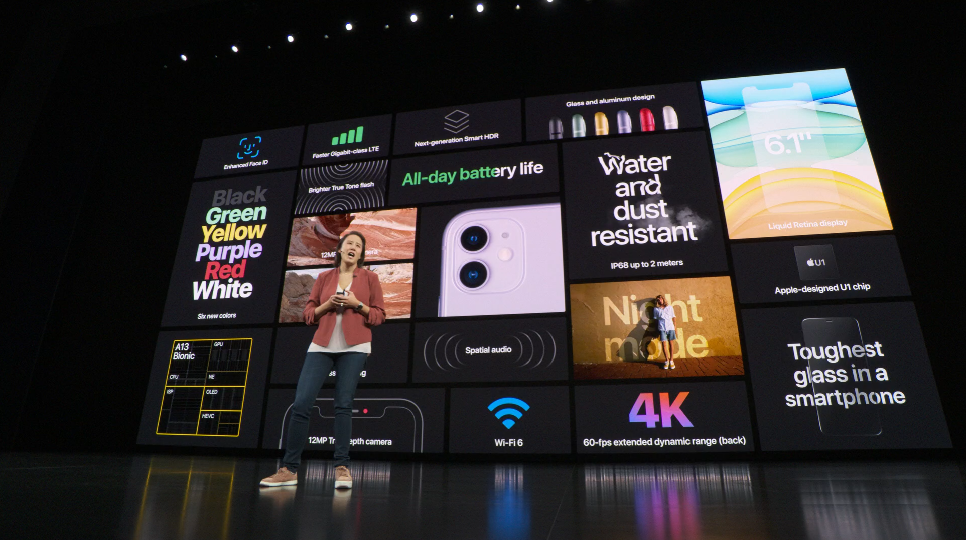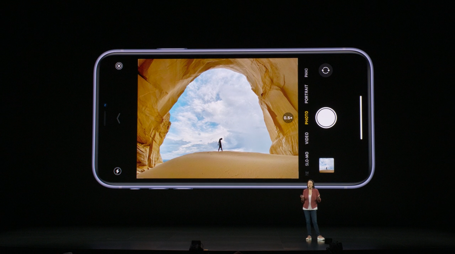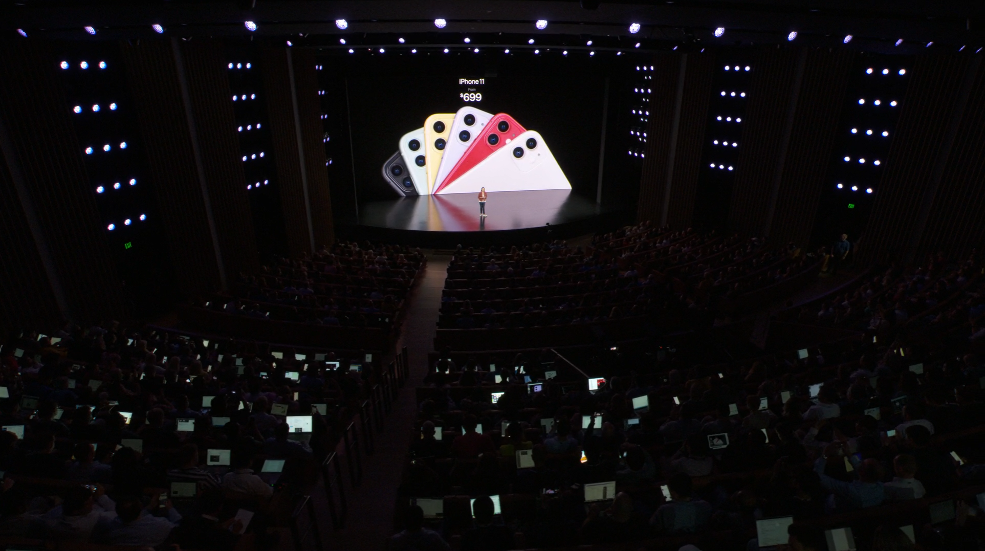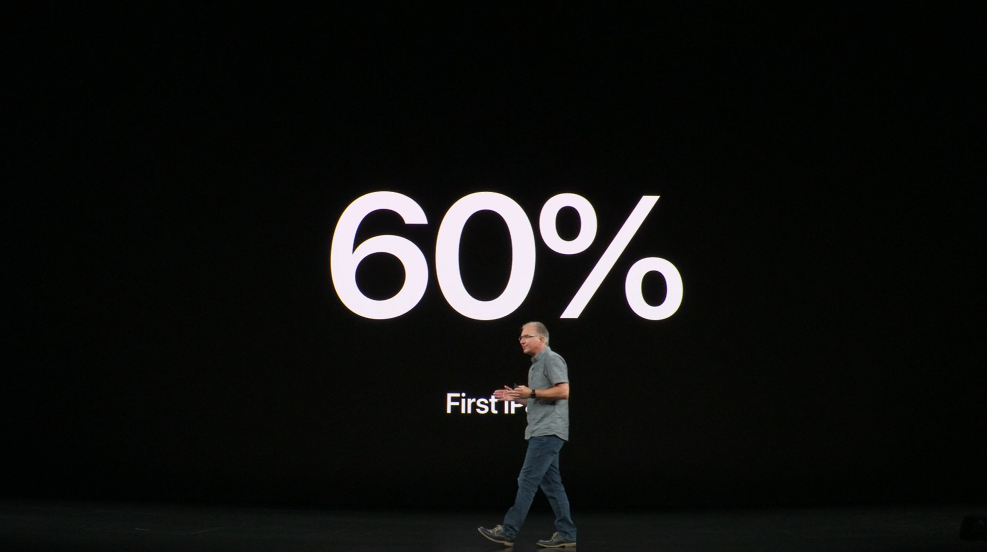 さてiPhoneの出番。顧客満足度99%らしい。ということで新しいiPhone 11。カラバリは6種類。ディスプレイは6.1インチ。カメラは2つ。背景消したりナイトモードとか。QuickTakeは写真でシャッター長押しで動画録画になるとか。スローモーションも上手に撮れるよ。チップは新しいA13かな。CPUもGPUも現行で一番速いとアピール(評価方法はよくわからない)。![]()