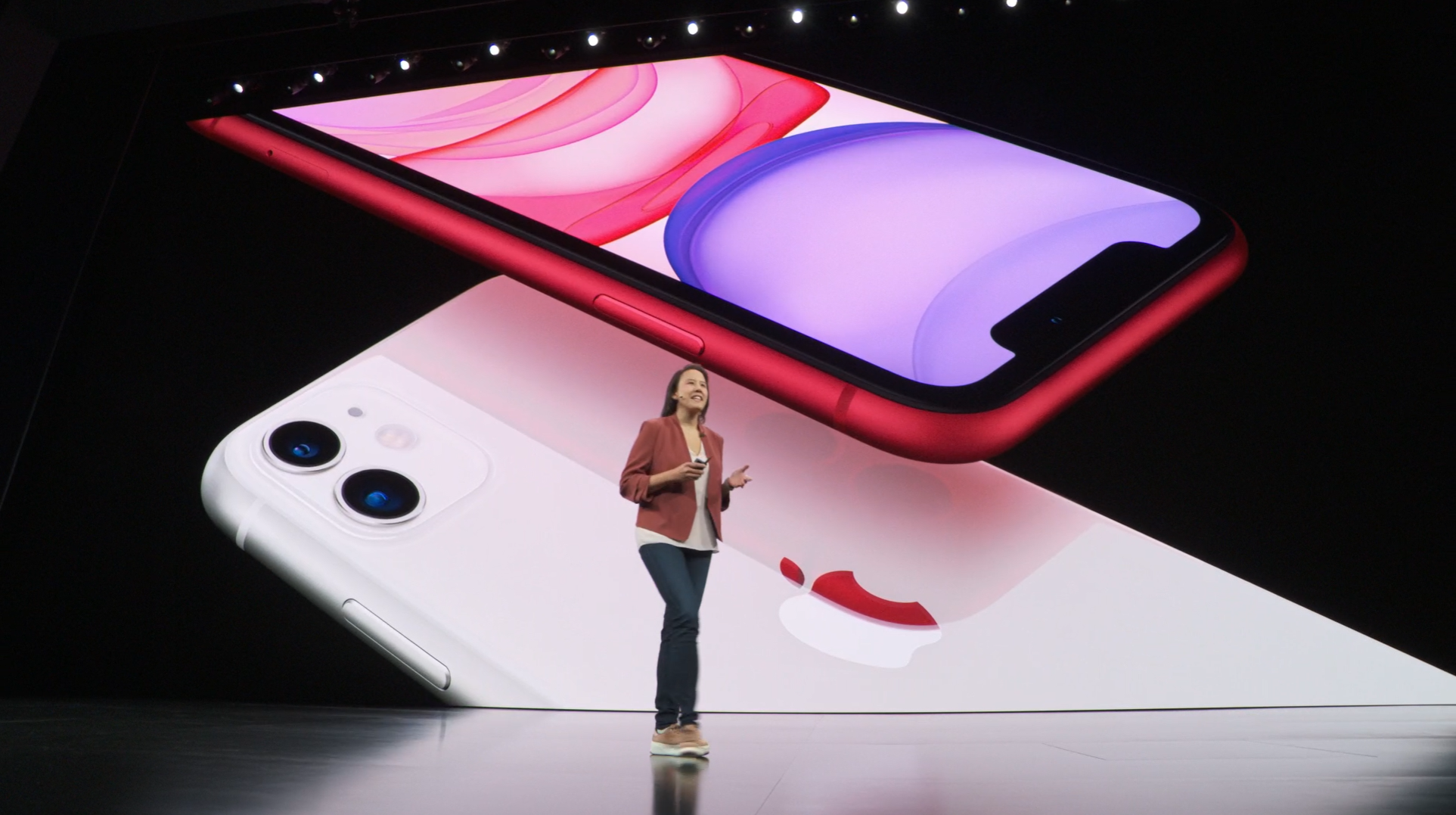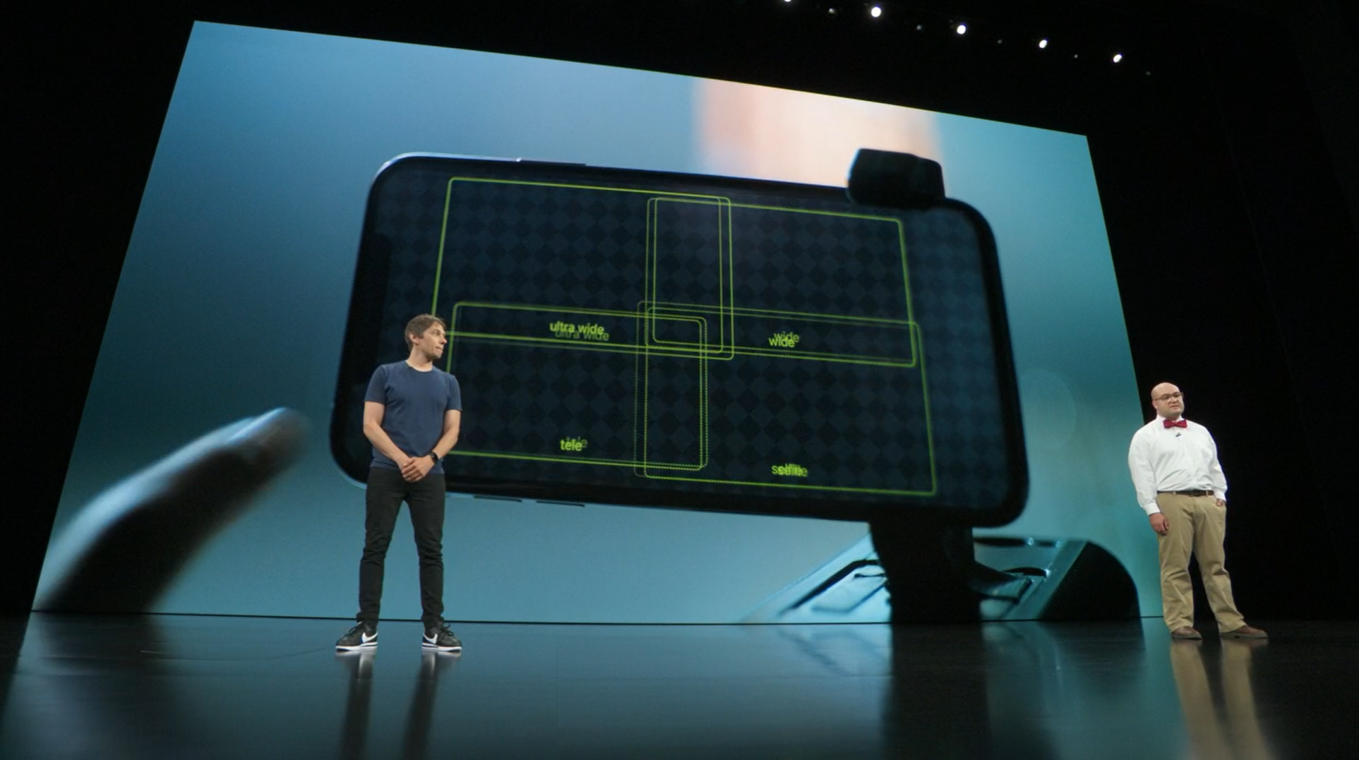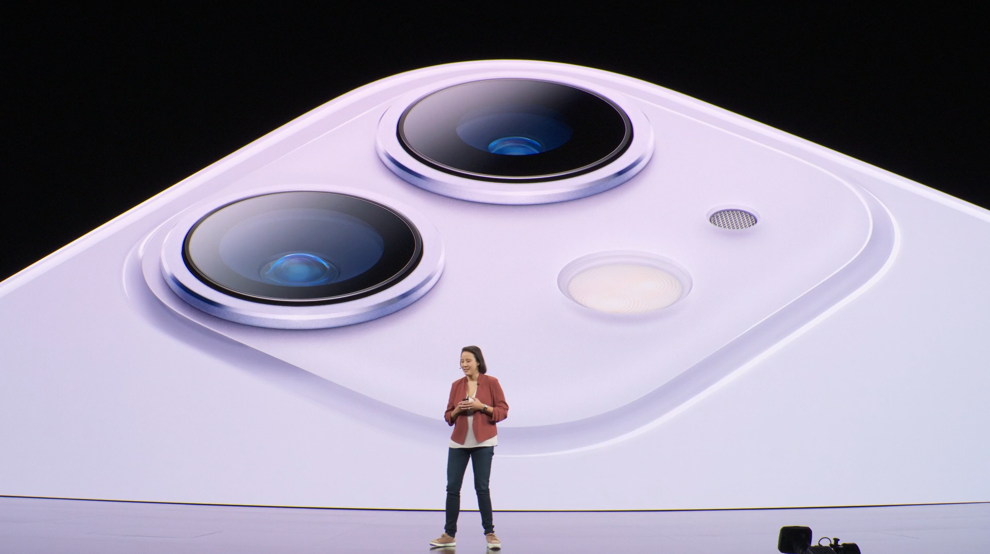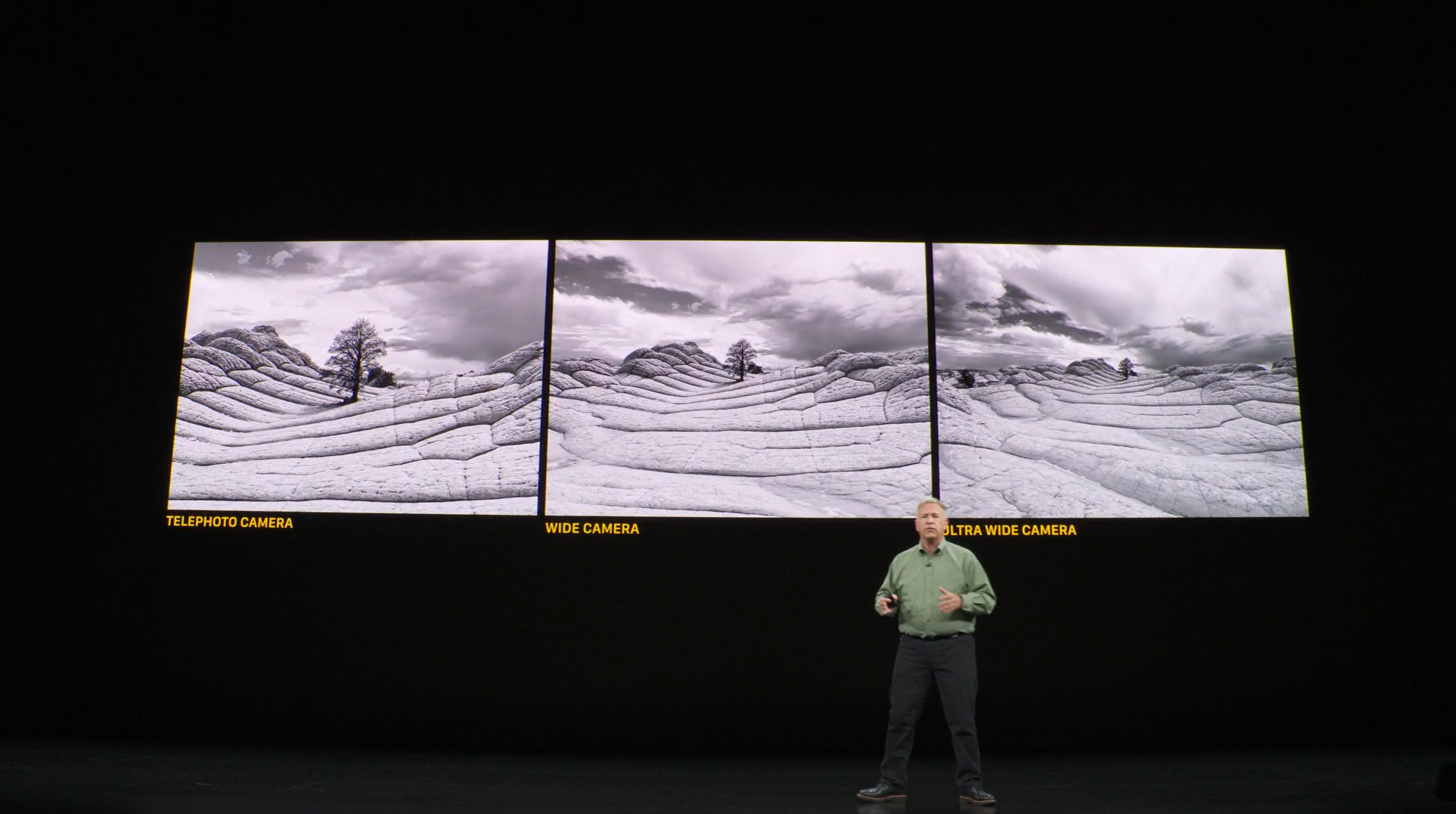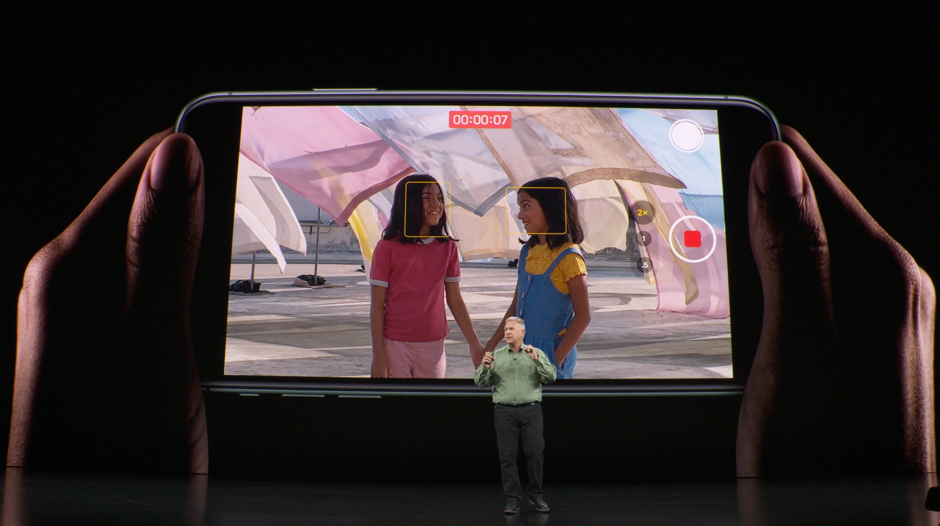 さてiPhoneの出番。顧客満足度99%らしい。ということで新しいiPhone 11。カラバリは6種類。ディスプレイは6.1インチ。カメラは2つ。背景消したりナイトモードとか。QuickTakeは写真でシャッター長押しで動画録画になるとか。スローモーションも上手に撮れるよ。チップは新しいA13かな。CPUもGPUも現行で一番速いとアピール(評価方法はよくわからない)。![]()