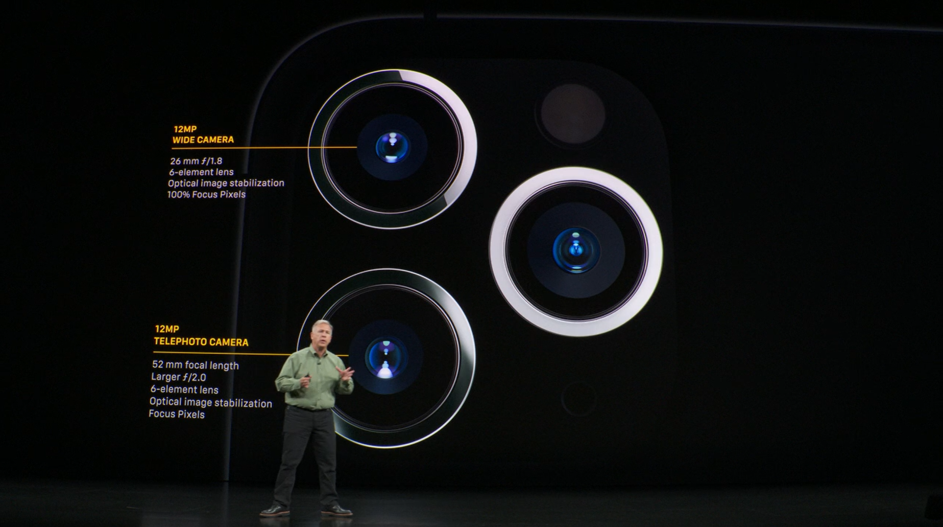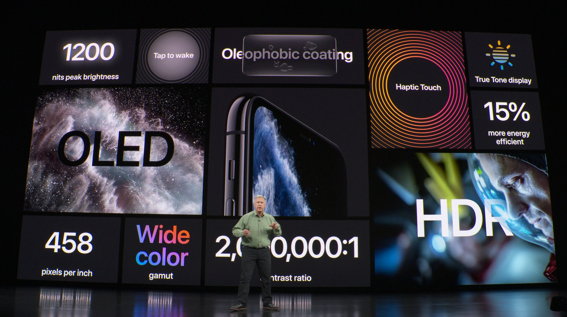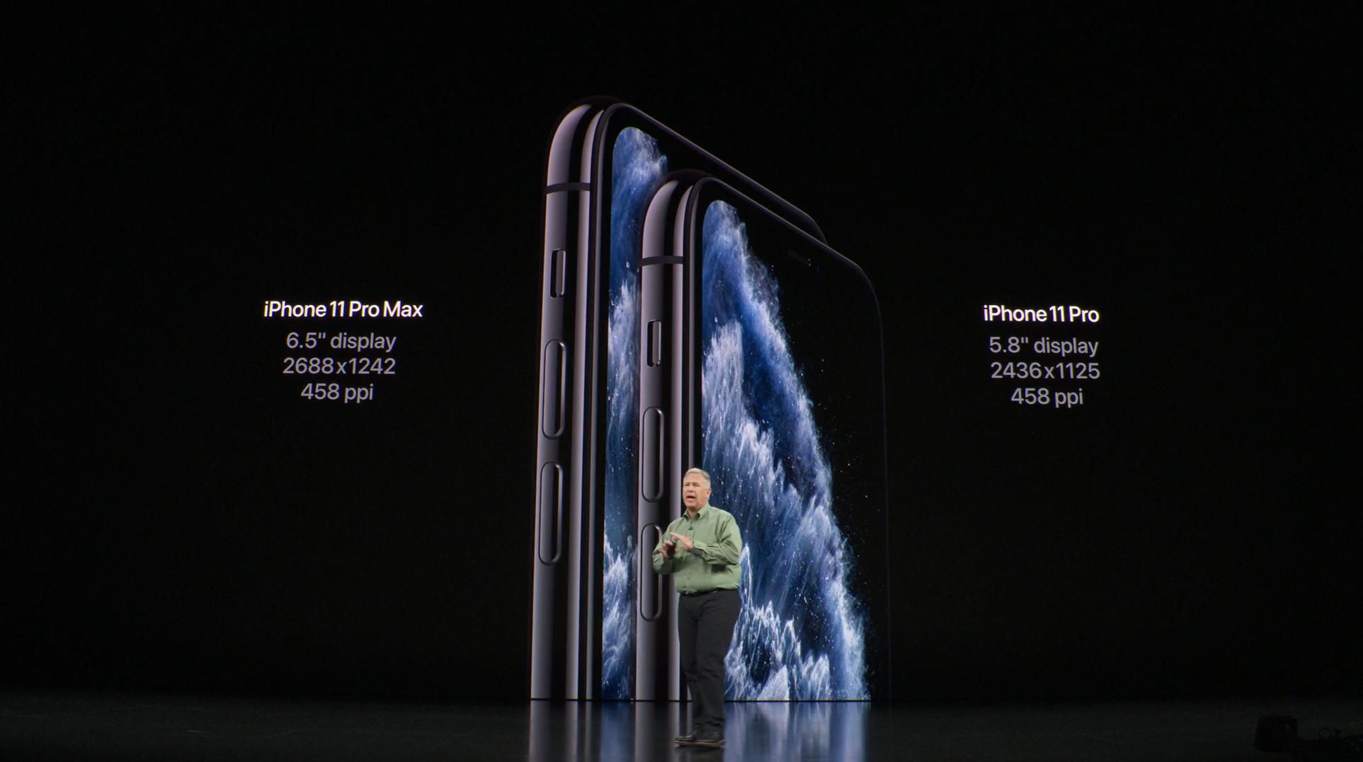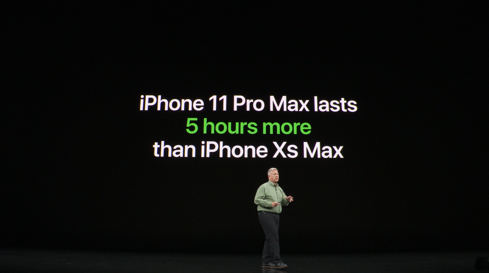 そして3カメラなiPhone 11 Pro。カラーは4種。6.5インチディスプレイな11 Pro Maxも。Super Retina XDR。チップはA13 Bionic。機械学習周りも強化されてますね。バッテリーはXSより4時間多く持つらしい。(11 Pro MaxはXS Maxより5時間多い)