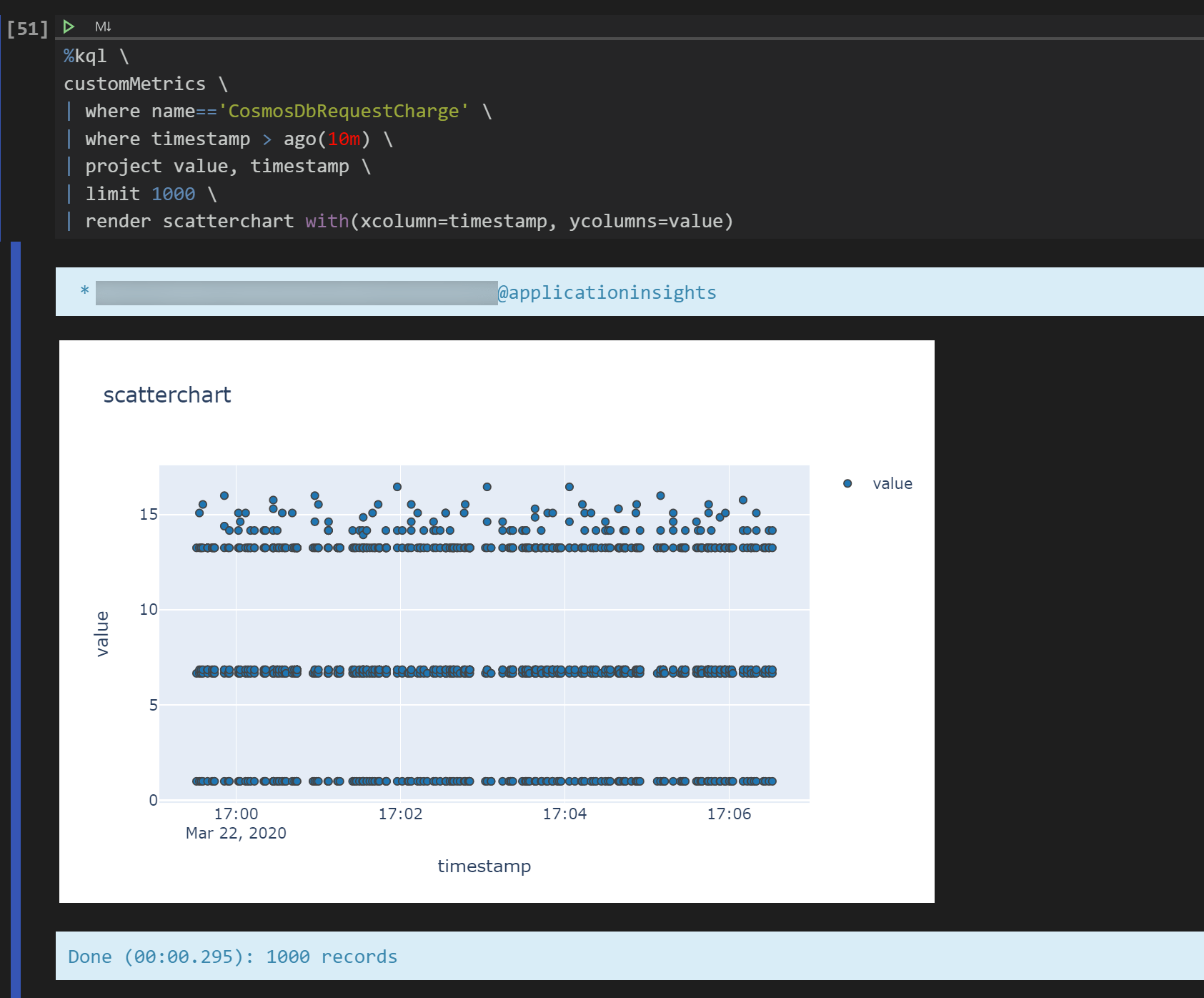 次にKQLを投げる先に接続します。以降は%kqlで呼び出せます。ヘルプもあるし特に困らないかと。ここではApplication Insightsにつなぐことにします。AppIDとApp Keyはあらかじめポータルから取得しておきましょう。