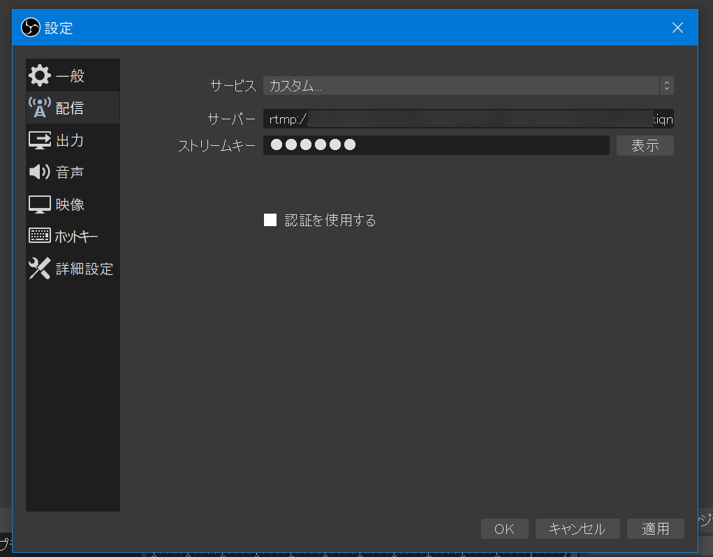 ドキュメント的にはこれでOKっぽいのですが実際に配信開始するとエラーになります。というわけでストリームキーも入れてあげないとダメなのですが、OBS Studioの場合はストリームキーに「123456」を設定します。(罠だ)