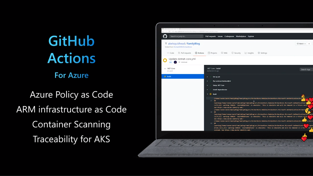 Azure関連のGitHub Actionsもいろいろでました。Azure Policy as Code、ARM IaCやコンテナースキャニング、AKSの追跡性アップなどなど。