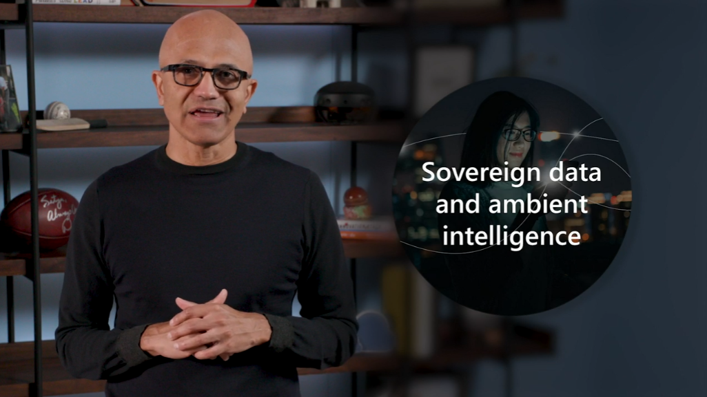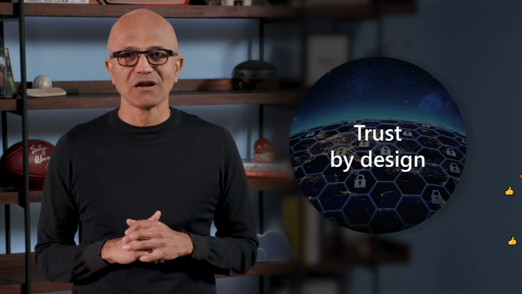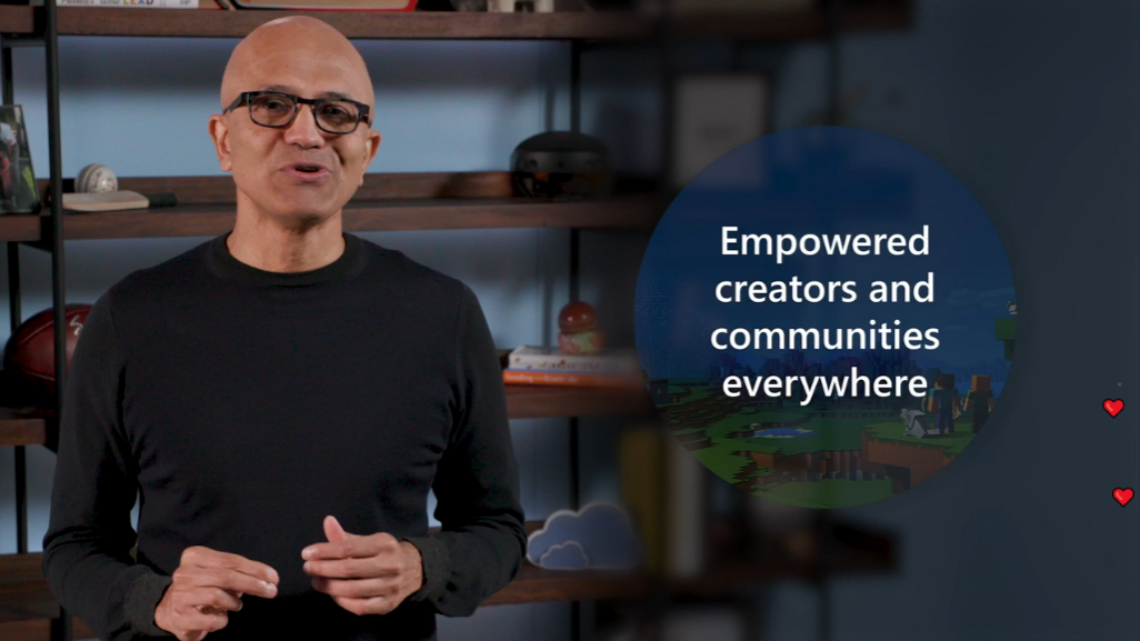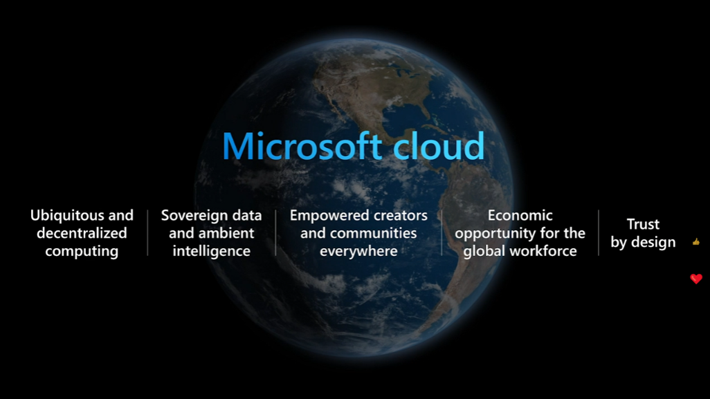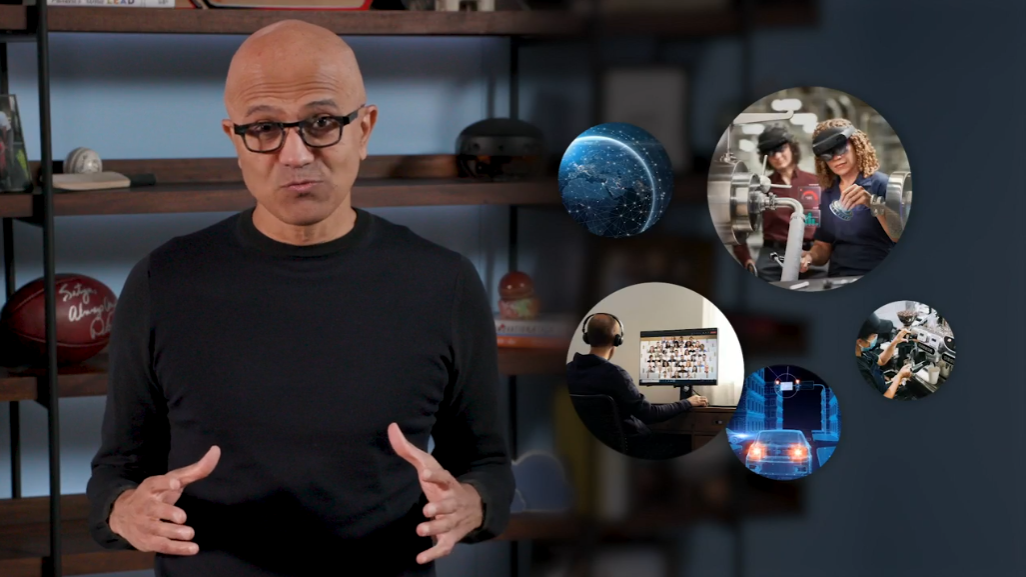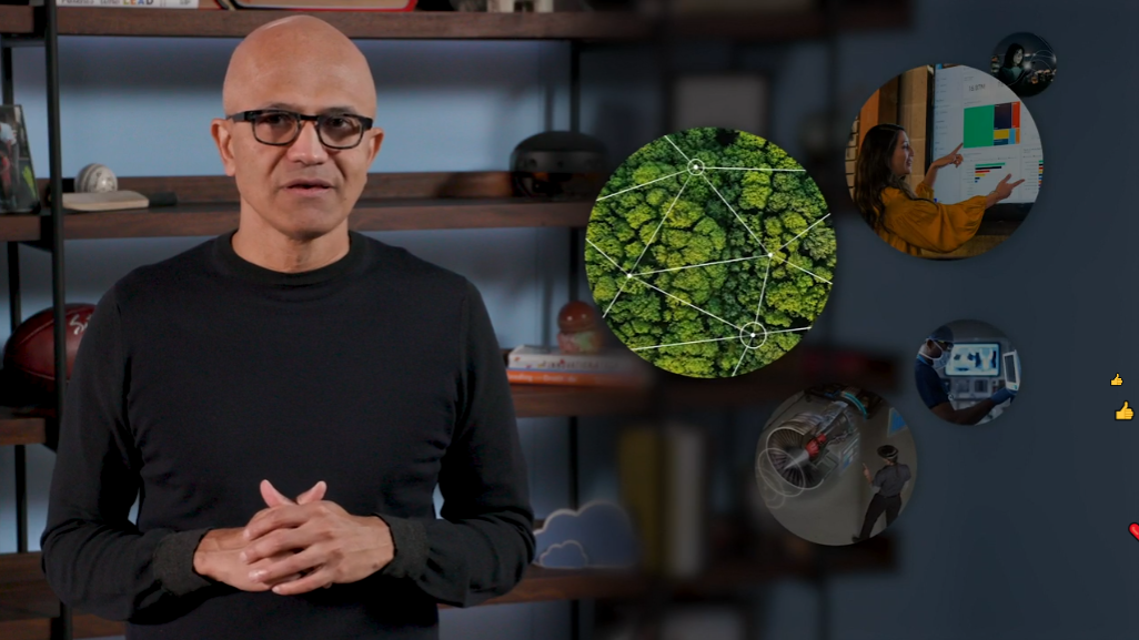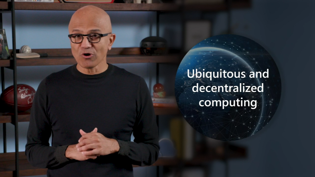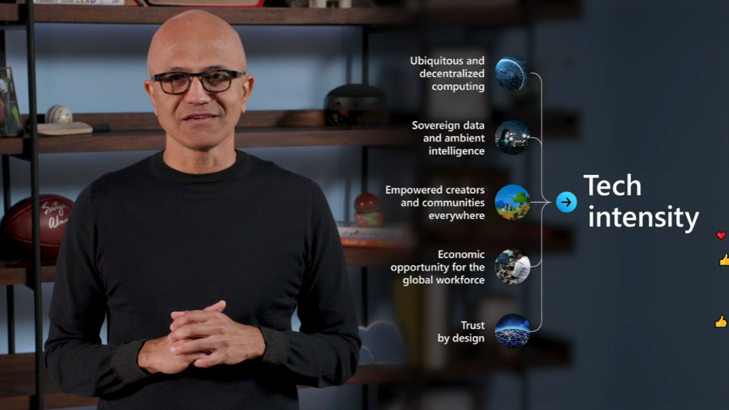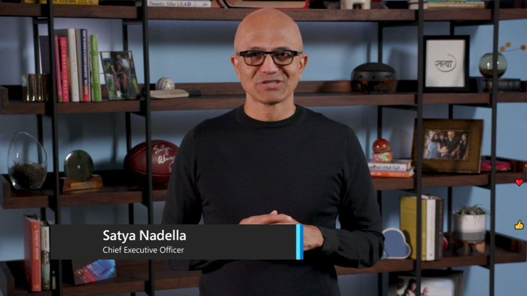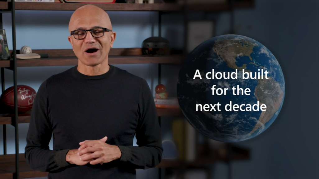 さて最初はSatya Nadella氏です。10年前にクラウドシフトしたMicrosoft。未来に向けてもっとコミットするために次を考えてる。