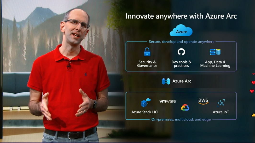 最初はHybridとマルチクラウド。WindowsだけでなくLinuxも、オンプレActive DirectoryもSQL ServerもEdgeでもみたいな。Hybridな事例ということでAzure Arc Enabledな話。どこのクラウドでも関係なくAzureのAPIで管理・接続できるという話。![]()