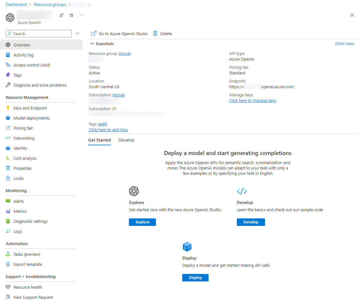 そんな感じでリソースはすぐ作れます。Azureポータル上は最低限の情報しかないですね。リソース固有の情報としてはキーやエンドポイント、デプロイモデルの管理あたりでしょうか。実際のモデルの開発などはAzure OpenAI Studioで行います。※ 慣れたらPython SDKとかREST APIもあるのでそちらもどうぞ。![]()