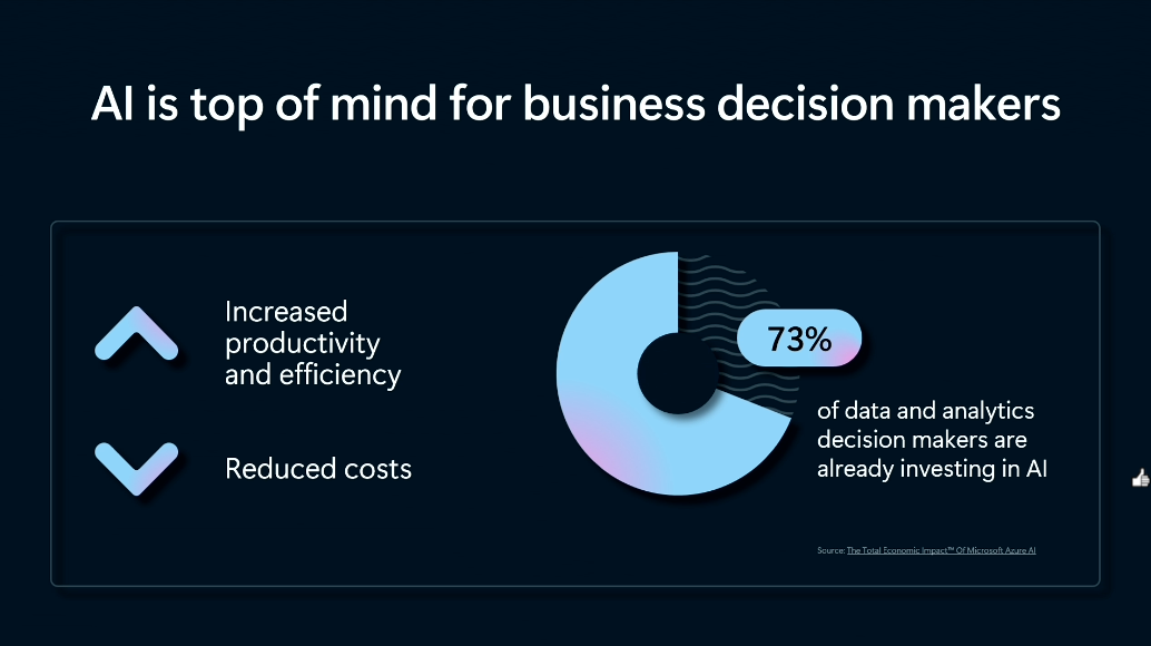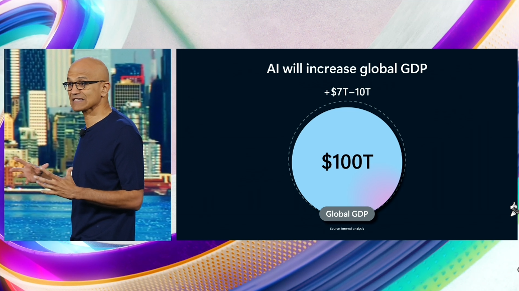 もちろんスピーカーはSatya氏。AIはコンピューティングのほぼすべての分野、カテゴリを変革する。変化の特徴は何か?の1つ目はUI、自然言語でより直感的なヒューマンコンピュータ―インターフェースに。2つ目は推論エンジン。自身のデータやコンテキストに基づいて機能をユーザーに提供できる、それを自然言語で。![]()