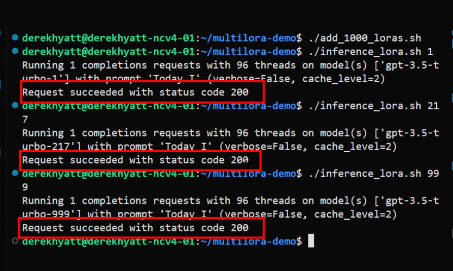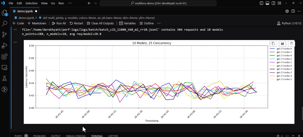 並列性のデモ。通常モデルとLoRAでFine-tuningしたモデルのレイテンシー比較しても大差ない。10モデルに対して25同時実行してもそれぞれで大きな差はない。