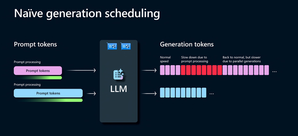 つまるところサービス提供側として安定して多数にサービス提供できるということ。LLMの使い方。生成が重いのかプロンプトが重いのかで特性が異なる。LLMで生成する際、プロンプトのトークンと生成する結果のトークンそれぞれで順次処理していくので複数くると干渉して応答が遅くなる。(ナイーブなほうだと1つ目が生成中に次のプロンプトのトークンが干渉して待ちになる)
