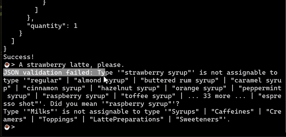 TypeChatのデモ。カフェのメニューのスキーマがあってラテを注文するとフィーマットされたJSONが返ってくる。スキーマ違反してるのを捕捉してどうしたらいいかをエラーで返せてる。