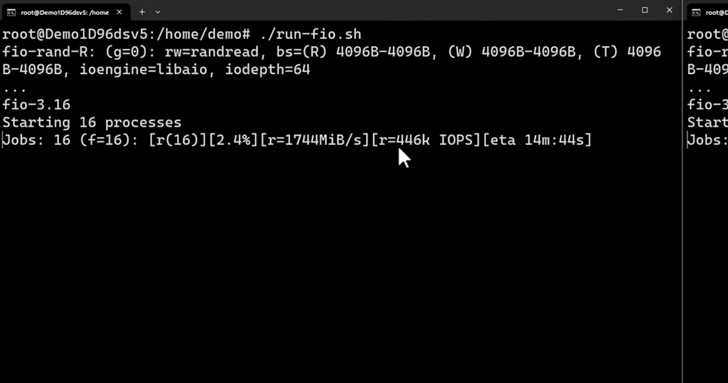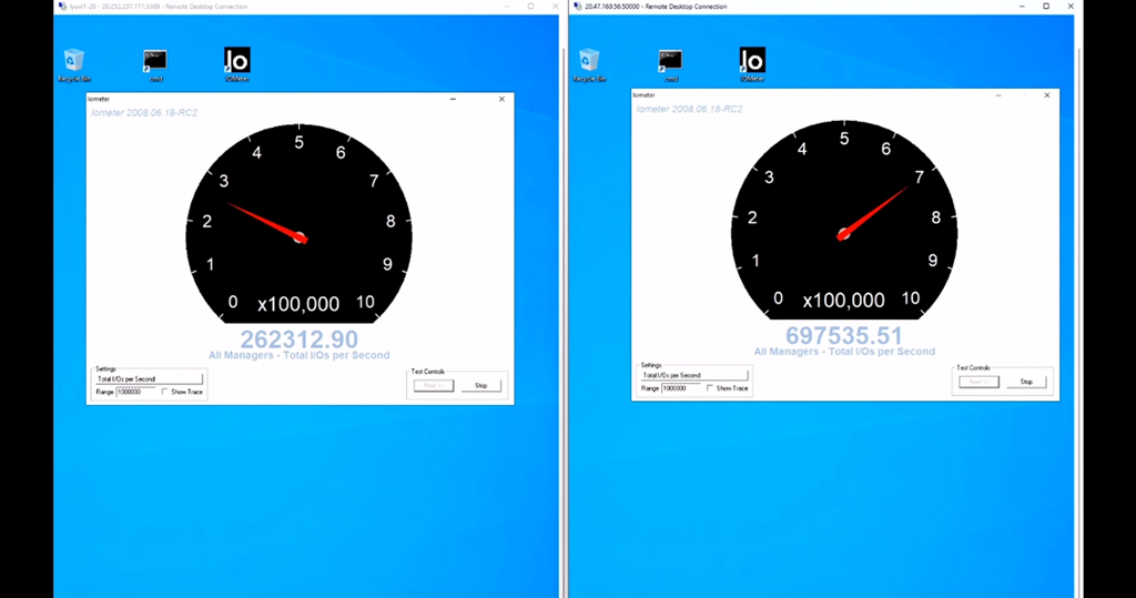 これがAzure Boost。シールが貼ってるところがFPGA。デモでは16台のディスクをつないでパフォーマンス見る感じ。4倍ぐらいですね(右側)。Linux上でのIOPSも段違いですね。