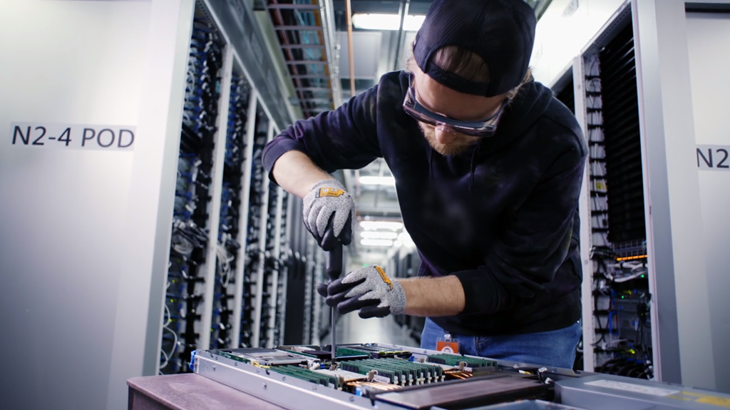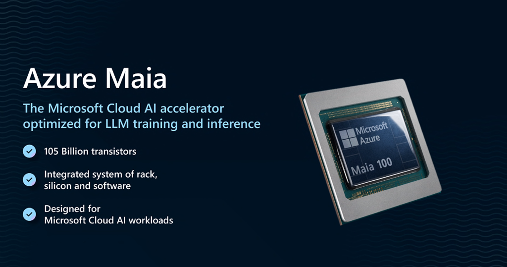 次のアクセラレーターの話はAzure Maia。Microsoft Cloud(Azure)上のAIワークロード(LLMの学習とか推論)に最適化したカスタムチップ。壇上にはチップ開発してるときの環境が。水冷してるわけじゃないので大学の寮を思い出すような感じの空冷。デバッグポートにセキュリティ用モジュール。