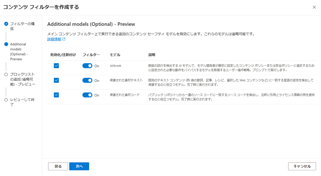 - 追加のモデルとして脱獄リスク検出、保護された素材テキストや保護された素材コードをフィルターできるようになりました。(Preview)