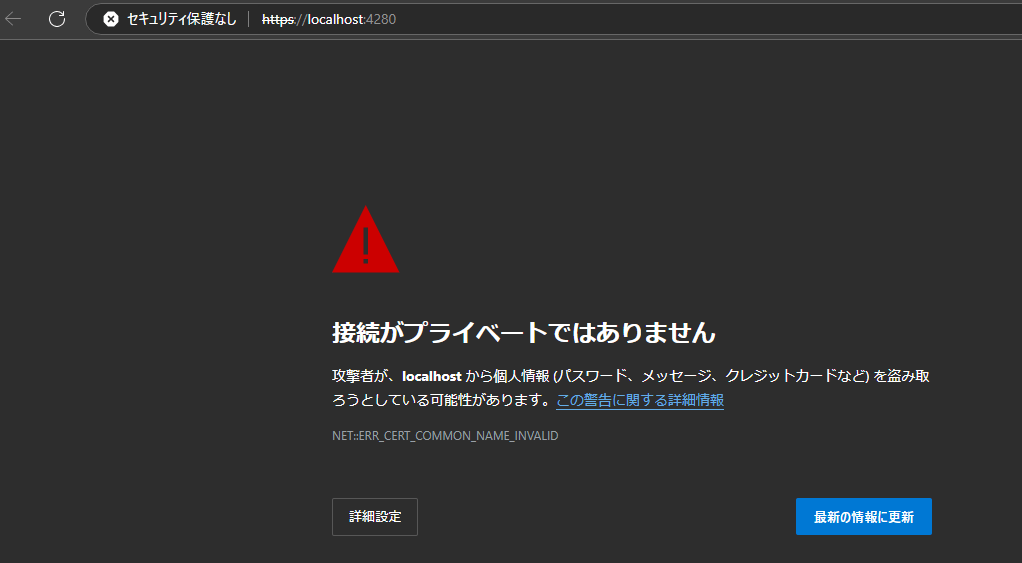 さてWebアプリを作っているとローカルホストとはいえHTTPS接続をしないといけないときがまれによくありますよね。SWA CLIでもHTTPS接続するためのオプションが用意されていて、こちらを使うと簡単にHTTPSを受け付けてくれるようになります。(警告にあるように未署名の自己署名証明書なので本番では使わないように)