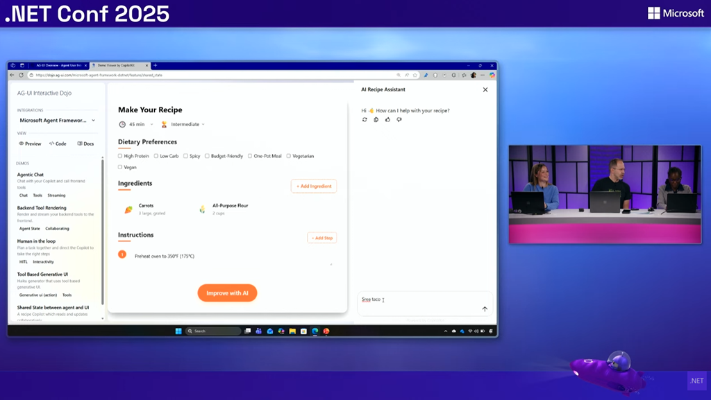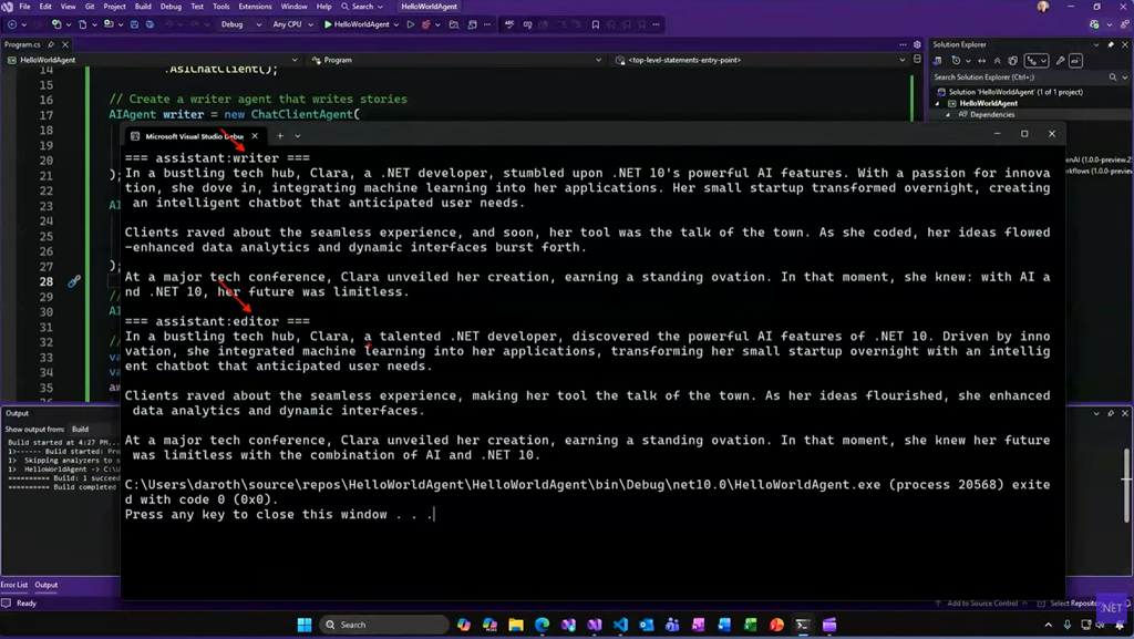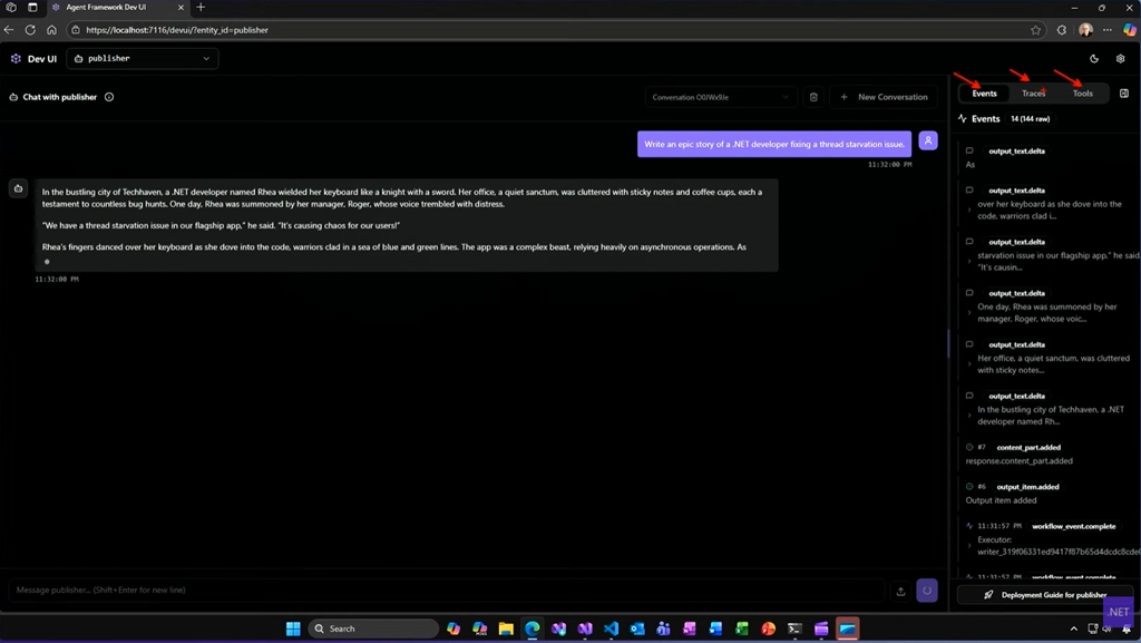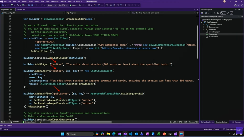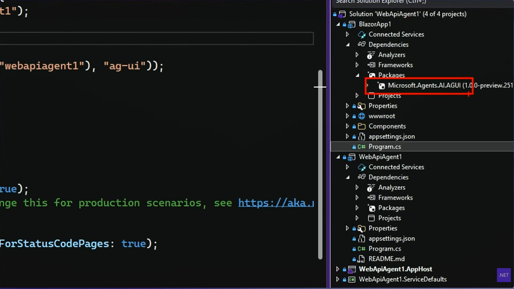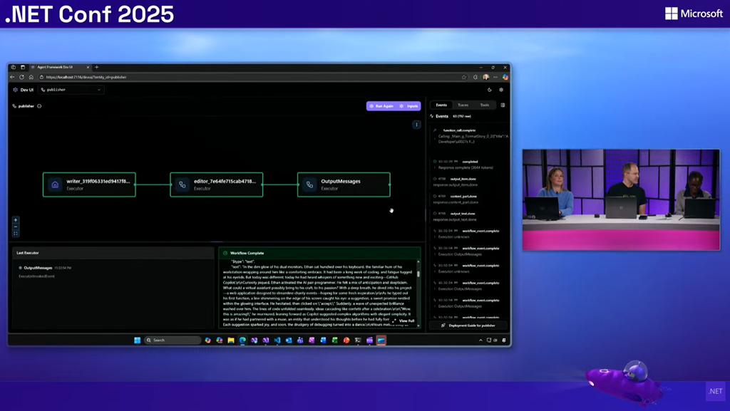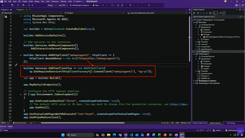 次はアプリにAgentを追加。Frameworkで簡単に追加したりできます。DevUIを使ってAgentのフローを可視化したりできます。新しく追加されたAG-UIもね。DIで簡単に追加できます。![]()