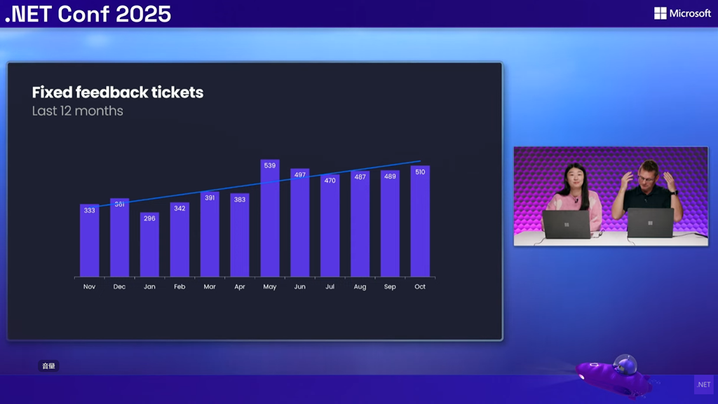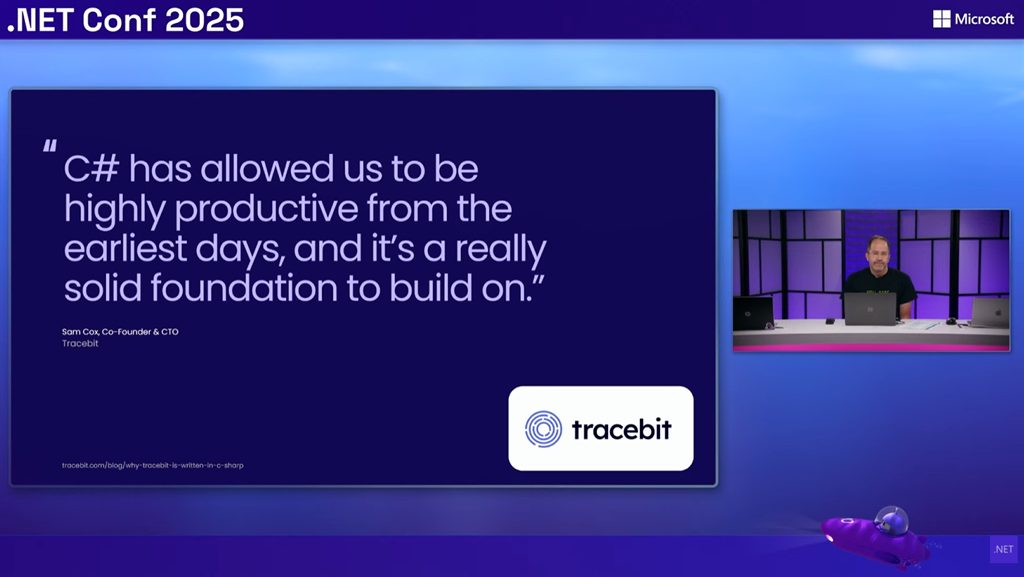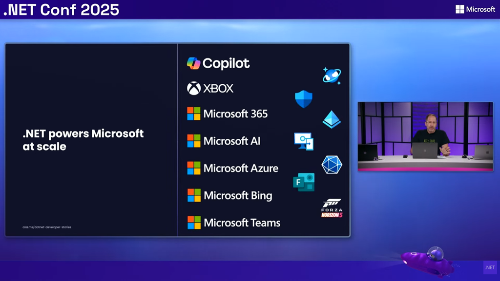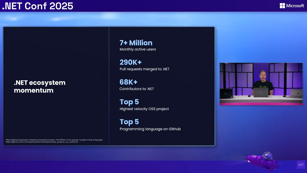 というわけでさっそく .NETの近況から。700万以上のユーザー、68000人のコントリビューターに支えられてる。Microsoft内のCopilotやXboxなどいろんなサービス内でも使われてます。![]()