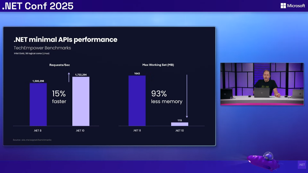 ミニマルAPIなパフォーマンス比較。 .NET 8との比較ですね。RPSでは15%速く、メモリ使用量は93%削減。これまでで最もパフォーマンスの高いバージョンですね。標準ライブラリでの改善なのですべてで恩恵が受けれますし、ハードウェア対応もいろいろ含まれてます。10年間に及ぶ投資の結果ですね。