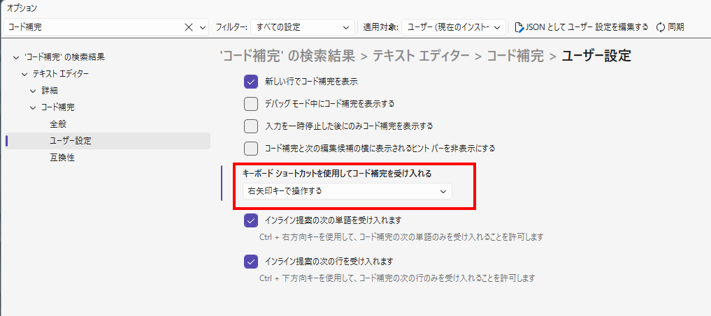 Visual Studio 2026 のコード補完の適用キーを変えたい話です。(Visual Studio 2022はこちら)