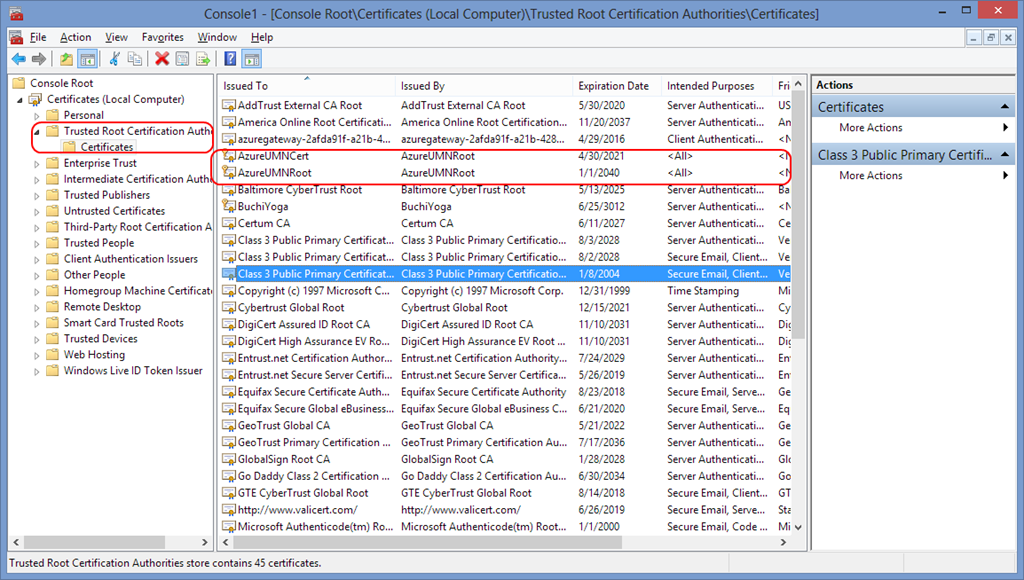 証明書の選択を省くためにはローカルコンピューター上の信頼されたルート証明機関に接続用の証明書を入れておく必要があります。