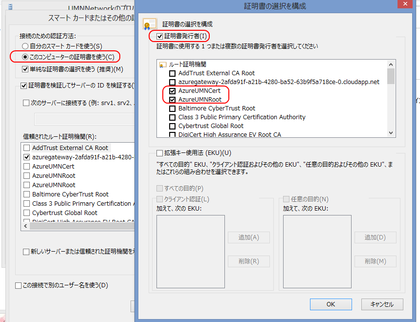 前回作成したVPN接続のプロパティを開き、セキュリティタブのEAPプロパティを表示させます。「このコンピュータの証明書を使う」になっていると思いますが、その横の拡張だかAdvancedだかのボタンをクリックして、先ほど登録した証明書(2種類)にチェックを入れます。