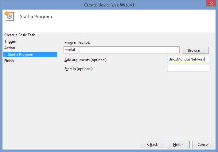 実行するプログラムは「rasdial」、引数に接続するVPN接続の名前を入れます。