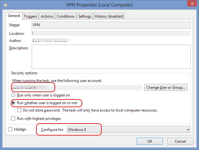 これで一応完了。作成後、プロパティを開き実行ユーザーは設定した人に、ログオンしていなくても実行できるようにして構成をWindows 8なりWindows RTなりにしておきます。