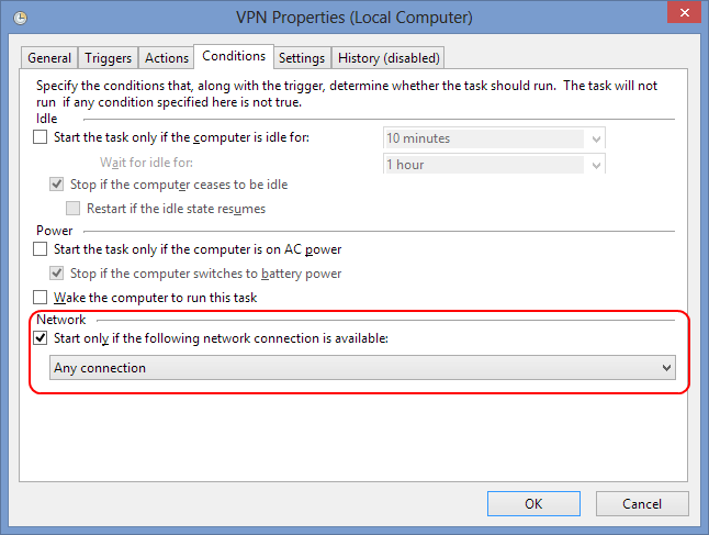 条件タブで任意のネットワーク接続が使用可能な場合のみタスクを開始するようにします。