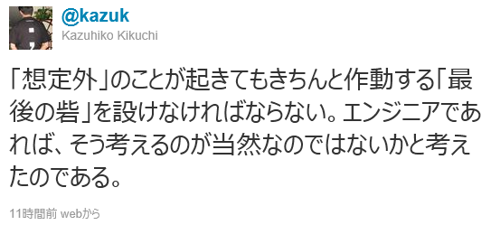 このツイートだけ切り出すのもどうかと思ったのですが。。で、TLとしてはたとえば例外全キャッチせずに本当の想定外ならアプリしんじゃえーとかにするとかそういうこと考えないといけないよねという話に。