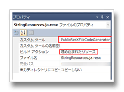 リソースファイルのプロパティでカスタムツールを PublicResXFileCodeGenerator にしてビルドアクションで”埋め込まれたリソース”にしておきます。