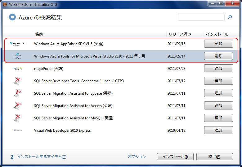 Azureで検索したら Azure AppFabric SDK 1.5とWindows Azure Tools for Microsoft Visual Studio 2010 – 2011年8月(リリース日が2011/09/14)の2つがでるので追加しましょう。