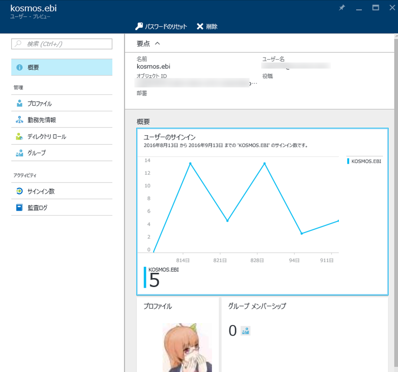 ユーザーの一覧とか。プロファイル情報だったりサインイン回数など見たりできます。ロールの変更など一通りの機能もすでに使えますね。個別ユーザーのパスワードリセットはユーザーのブレードの上部メニューから可能です。![]()