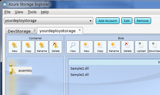 ビルドしたアセンブリはBlobにUpしておきましょう。