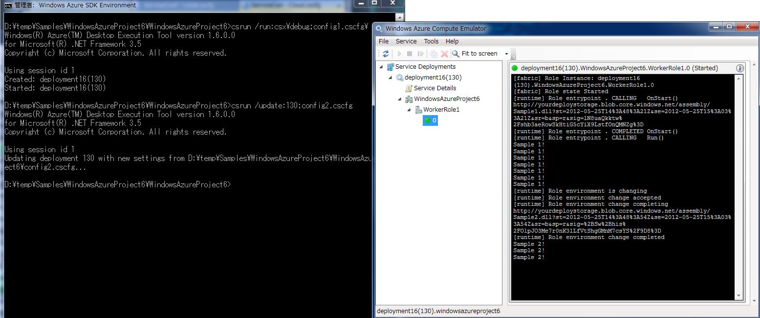 起動した時はSample1.dllがロードされて、サービス設定ファイルをSample2.dllに変更してUpdateしたらちゃんとロードしなおされてますね!
