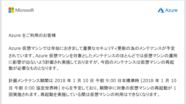 年明けにAzure VMsの計画メンテナンスが予定されている旨のメールがきました。