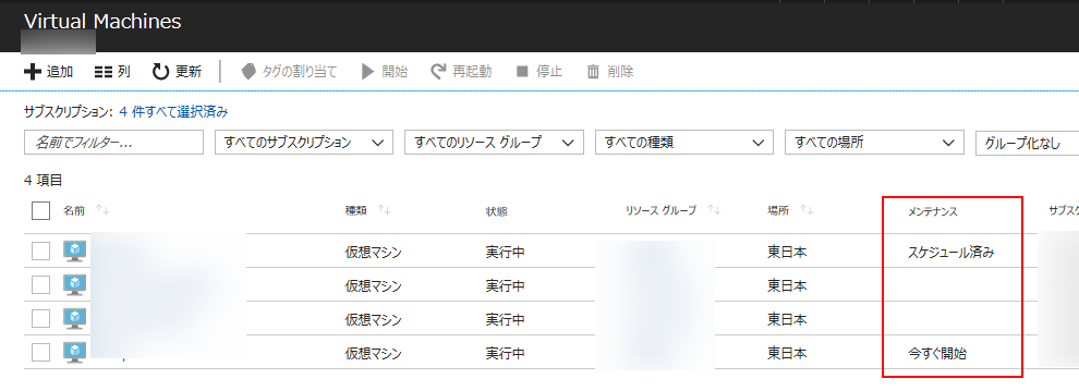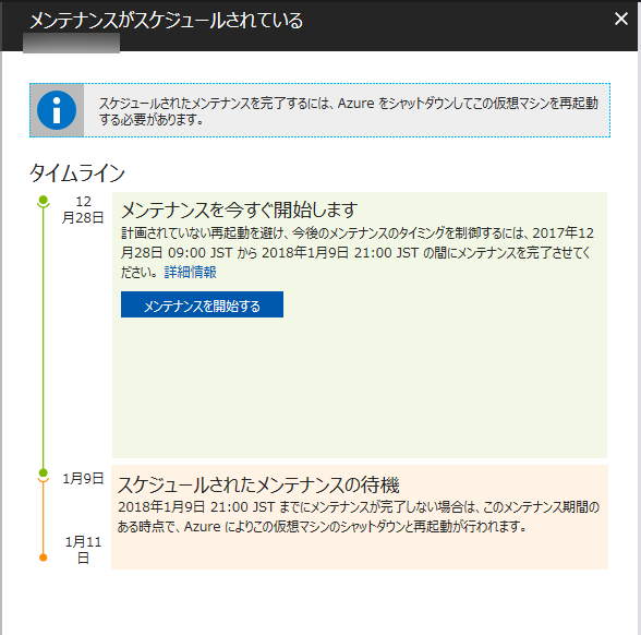 さて、今回から再起動されるタイミングをコントロールできるようになりました。メンテナンス対象のVMの場合、ポータル上のブレードに案内が表示されます。